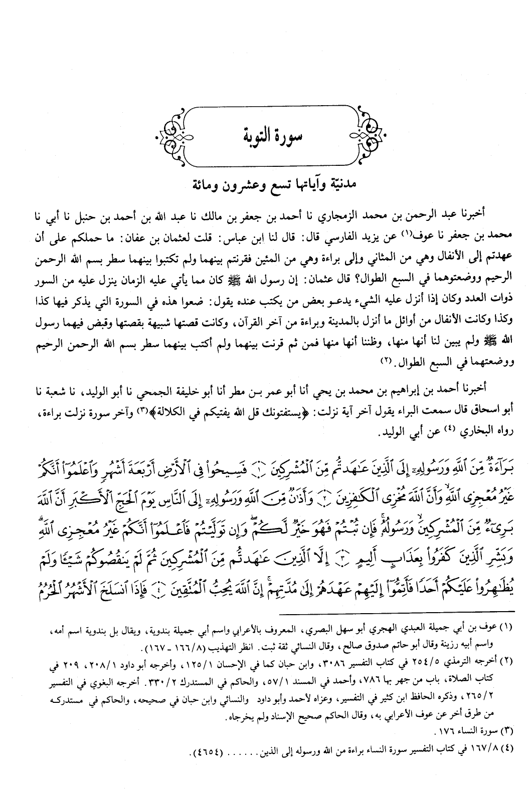 {بَرَاءَةٌ مِنَ اللَّهِ وَرَسُولِهِ إِلَى الَّذِينَ عَاهَدْتُمْ مِنَ الْمُشْرِكِينَ {1} فَسِيحُوا فِي الأَرْضِ أَرْبَعَةَ أَشْهُرٍ وَاعْلَمُوا أَنَّكُمْ غَيْرُ مُعْجِزِي اللَّهِ وَأَنَّ اللَّهَ مُخْزِي الْكَافِرِينَ {2} وَأَذَانٌ مِنَ اللَّهِ وَرَسُولِهِ إِلَى النَّاسِ يَوْمَ الْحَجِّ الأَكْبَرِ أَنَّ اللَّهَ بَرِيءٌ مِنَ الْمُشْرِكِينَ وَرَسُولُهُ فَإِنْ تُبْتُمْ فَهُوَ خَيْرٌ لَكُمْ وَإِنْ تَوَلَّيْتُمْ فَاعْلَمُوا أَنَّكُمْ غَيْرُ مُعْجِزِي اللَّهِ وَبَشِّرِ الَّذِينَ كَفَرُوا بِعَذَابٍ أَلِيمٍ {3} إِلا الَّذِينَ عَاهَدْتُمْ مِنَ الْمُشْرِكِينَ ثُمَّ لَمْ يَنْقُصُوكُمْ شَيْئًا وَلَمْ يُظَاهِرُوا عَلَيْكُمْ أَحَدًا فَأَتِمُّوا إِلَيْهِمْ عَهْدَهُمْ إِلَى مُدَّتِهِمْ إِنَّ اللَّهَ يُحِبُّ الْمُتَّقِينَ {4} فَإِذَا انْسَلَخَ الأَشْهُرُ الْحُرُمُ