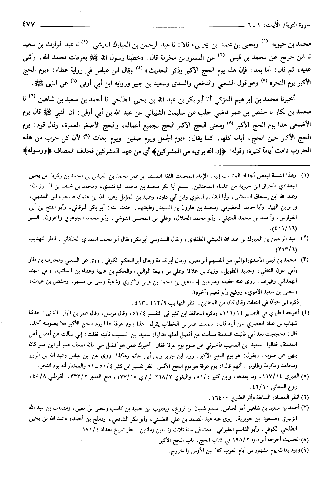 ومعنى الحج الأكبر: الحج بجميع أعماله، والحج الأصغر العمرة، وقال قوم: يوم الحج الأكبر حين الحج أيامه كلها، كما يقال: يوم الجمل، ويوم صفين، ويوم بعاث لأن كل حرب من هذه الحروب دامت أياما كثيرة.