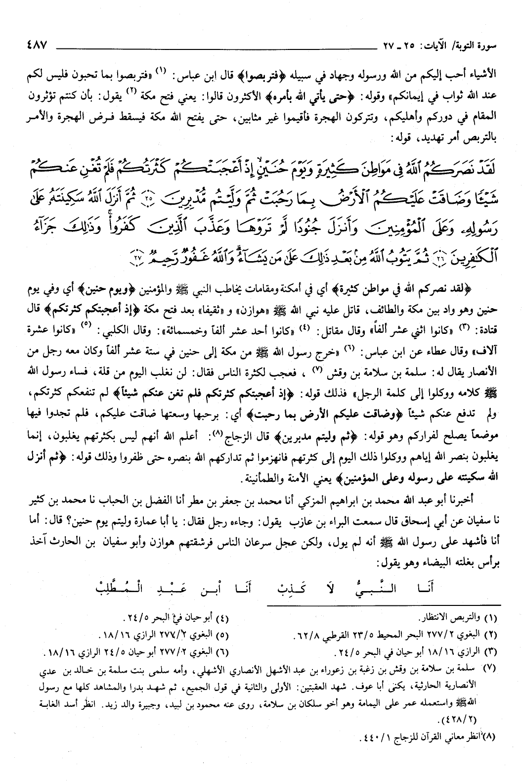 فذلك قوله: {إِذْ أَعْجَبَتْكُمْ كَثْرَتُكُمْ فَلَمْ تُغْنِ عَنْكُمْ شَيْئًا} [التوبة: 25] لم تنفعكم كثرتكم ولم تدفع عنكم شيئا، {وَضَاقَتْ عَلَيْكُمُ الأَرْضُ بِمَا رَحُبَتْ} [التوبة: 25] أي: برحبها وسعتها ضاقت عليكم، فلم تجدوا فيها موضع يصلح لفراركم، وهو قوله: {ثُمَّ وَلَّيْتُمْ مُدْبِرِينَ} [التوبة: 25] قال الزجاج: أعلم الله أنهم ليس بكثرتهم يغلبون، إنما يغلبون بنصر الله إياهم، ووكلوا ذلك اليوم إلى كثرتهم فانهزموا، ثم تداركهم الله بنصره حتى ظفروا، وذلك قوله: {ثُمَّ أَنْزَلَ اللَّهُ سَكِينَتَهُ عَلَى رَسُولِهِ وَعَلَى الْمُؤْمِنِينَ} [التوبة: 26] يعني: الأمنة والطمأنينة.
