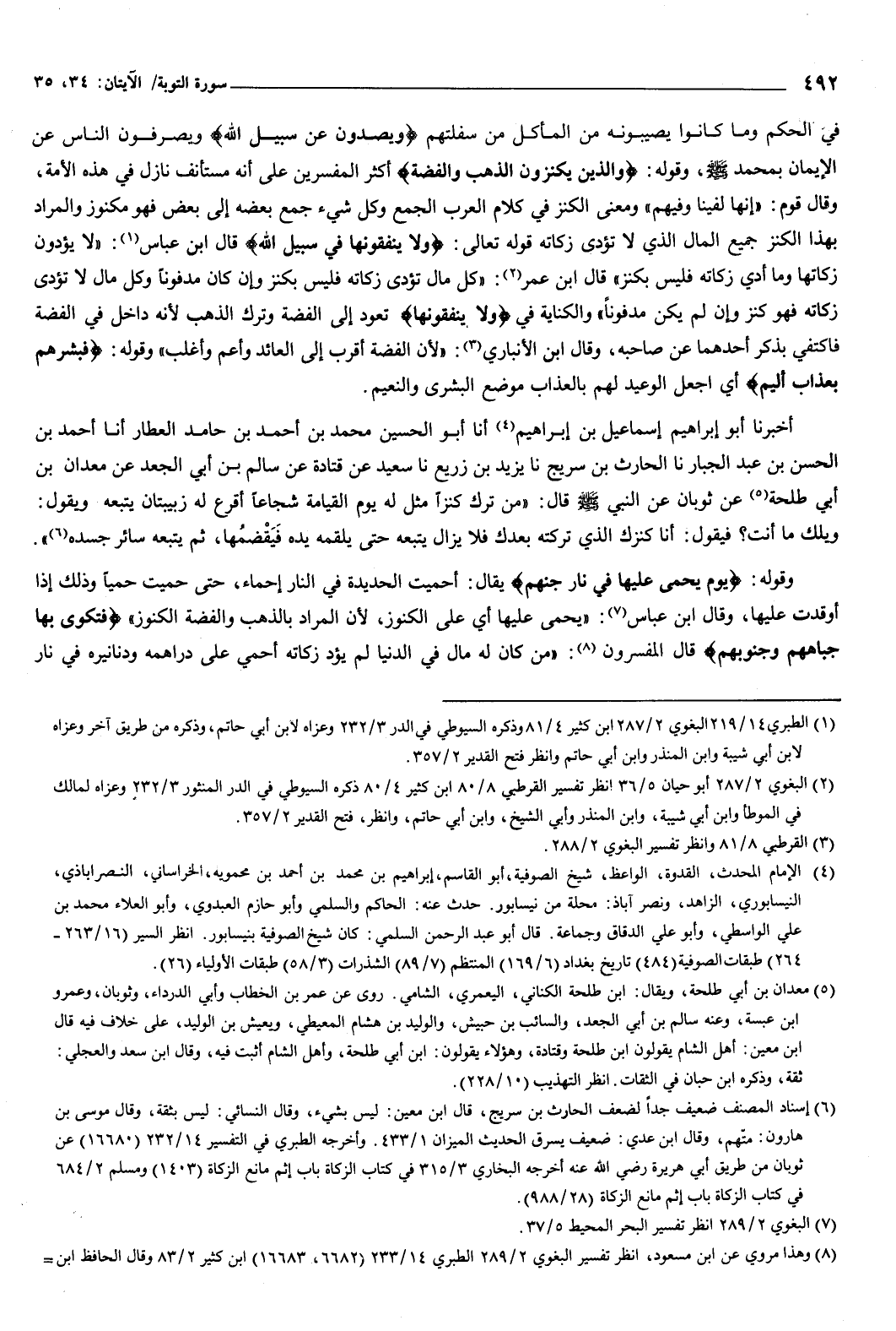 في الحكم وما كانوا يصيبونه من المأكل من سفلتهم، {وَيَصُدُّونَ عَنْ سَبِيلِ اللَّهِ} [التوبة: 34] ويصرفون الناس عن الإيمان بمحمد صَلَّى اللهُ عَلَيْهِ وَسَلَّمَ، وقوله: {وَالَّذِينَ يَكْنِزُونَ الذَّهَبَ وَالْفِضَّةَ} [التوبة: 34] أكثر المفسرين على أنه مستأنف نازل في هذه الأمة، وقال قوم: إنا لفينا وفيهم.