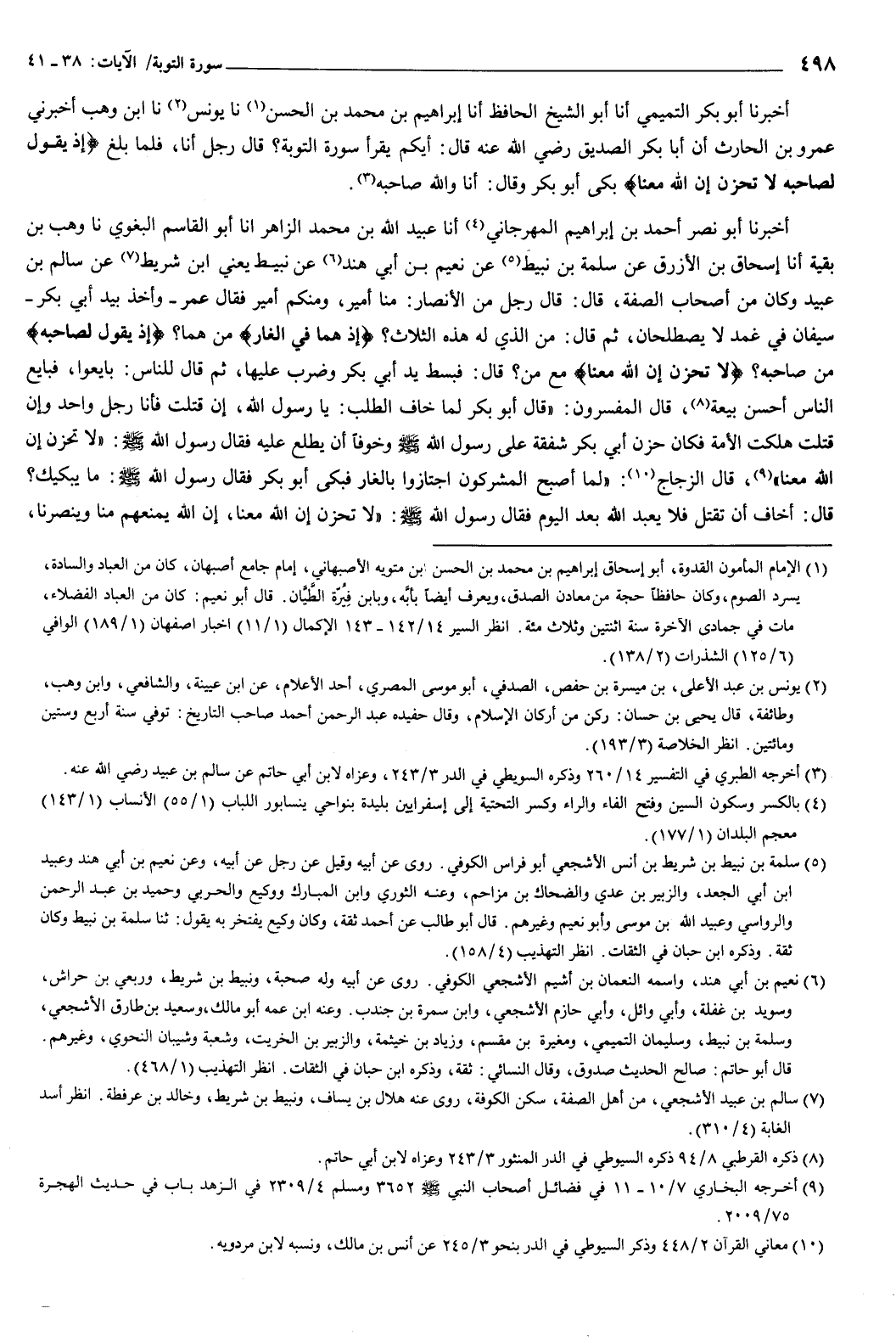412 - أَخْبَرَنَا أَبُو بَكْرٍ التَّمِيمِيُّ، أنا أَبُو الشَّيْخِ الْحَافِظُ، أنا إِبْرَاهِيمُ بْنُ مُحَمَّدِ بْنِ الْحَسَنِ، نا يُونُسُ، نا ابْنُ وَهْبٍ، أَخْبَرَنِي عَمْرُو بْنُ الْحَارِثِ، أَنَّ أَبَا بَكْرٍ الصِّدِّيقَ رَضِيَ اللَّهُ عَنْهُ قَالَ: أَيُّكُمْ يَقْرَأُ سُورَةَ التَّوْبَةِ؟ قَالَ رَجُلٌ: أَنَا، فَلَمَّا بَلَغَ {إِذْ يَقُولُ لِصَاحِبِهِ لا تَحْزَنْ إِنَّ اللَّهَ مَعَنَا} [التوبة: 40] بَكَى أَبُو بَكْرٍ وَقَالَ: أَنَا وَاللَّهِ صَاحِبُهُ
