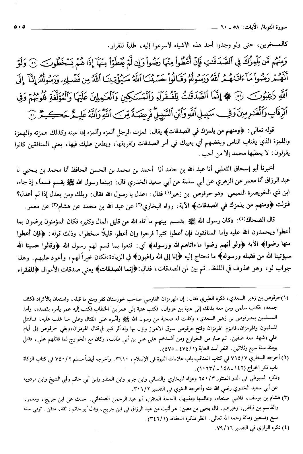 416 - أَخْبَرَنَا أَبُو إِسْحَاقَ الثَّعْلَبِيُّ، أنا عَبْدُ اللَّهِ بْنُ حَامِدٍ، أنا أَحْمَدُ بْنُ مُحَمَّدِ بْنِ الْحَسَنِ الْحَافِظُ، أنا مُحَمَّدُ بْنُ يَحْيَى، نا عَبْدُ الرَّزَّاقِ، أنا مَعْمَرٌ، عَنِ الزُّهْرِيِّ، عَنْ أَبِي سَلَمَةَ، عَنْ أَبِي سَعِيدٍ الْخُدْرِيِّ، قَالَ: بَيْنَمَا رَسُولُ اللَّهِ صَلَّى اللهُ عَلَيْهِ وَسَلَّمَ يَقْسِمُ قَسْمًا، إِذْ جَاءَهُ ابْنُ ذِي الْخُوَيْصِرَةِ التَّمِيمِيُّ وَهُوَ حُرْقُوصُ بْنُ زُهَيْرٍ، فَقَالَ: اعْدِلْ يَا رَسُولَ اللَّهِ، فَقَالَ: «وَيْلَكَ وَمَنْ يَعْدِلُ إِذَا لَمْ أَعْدِلْ؟» فَنَزَلَتْ {وَمِنْهُمْ مَنْ يَلْمِزُكَ فِي الصَّدَقَاتِ} [التوبة: 58] الآيَةَ، رَوَاهُ الْبُخَارِيُّ، عَنْ عَبْدِ اللَّهِ بْنِ مُحَمَّدٍ، عَنْ هِشَامٍ، عَنْ مَعْمَرٍ