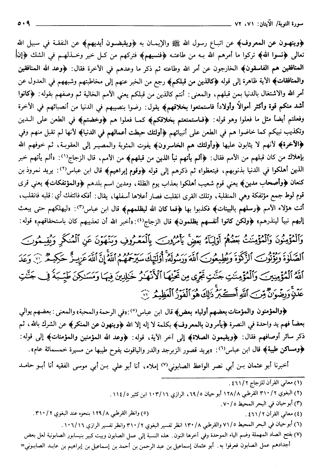قوله: {وَالْمُؤْمِنُونَ وَالْمُؤْمِنَاتُ بَعْضُهُمْ أَوْلِيَاءُ بَعْضٍ يَأْمُرُونَ بِالْمَعْرُوفِ وَيَنْهَوْنَ عَنِ الْمُنْكَرِ وَيُقِيمُونَ الصَّلاةَ وَيُؤْتُونَ الزَّكَاةَ وَيُطِيعُونَ اللَّهَ وَرَسُولَهُ أُولَئِكَ سَيَرْحَمُهُمُ اللَّهُ إِنَّ اللَّهَ عَزِيزٌ حَكِيمٌ {71} وَعَدَ اللَّهُ الْمُؤْمِنِينَ وَالْمُؤْمِنَاتِ جَنَّاتٍ تَجْرِي مِنْ تَحْتِهَا الأَنْهَارُ خَالِدِينَ فِيهَا وَمَسَاكِنَ طَيِّبَةً فِي جَنَّاتِ عَدْنٍ وَرِضْوَانٌ مِنَ اللَّهِ أَكْبَرُ ذَلِكَ هُوَ الْفَوْزُ الْعَظِيمُ {72} } [التوبة: 71-72] {وَالْمُؤْمِنُونَ وَالْمُؤْمِنَاتُ بَعْضُهُمْ أَوْلِيَاءُ بَعْضٍ} [التوبة: 71] قال ابن عباس: في الرحمة والمحبة.