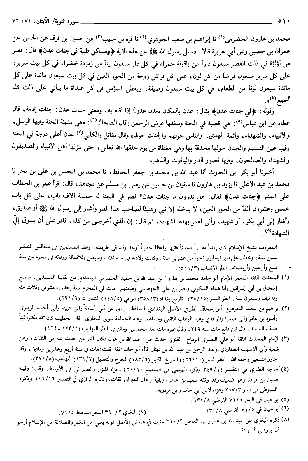 مُحَمَّدُ بْنُ هَارُونَ الْحَضْرَمِيُّ، نا إِبْرَاهِيمُ بْنُ سَعِيدٍ الْجَوْهَرِيُّ، نا قُرَّةُ بْنُ حَبِيبٍ، عَنْ حُسَيْنِ بْنِ فَرْقَدٍ، عَنِ الْحَسَنِ، عَنْ عِمْرَانَ بْنِ حُصَيْنٍ، وَعَنْ أَبِي هُرَيْرَةَ قَالا: سُئِلَ رَسُولُ اللَّهِ صَلَّى اللهُ عَلَيْهِ وَسَلَّمَ عَنْ هَذِهِ الآيَةِ {وَمَسَاكِنَ طَيِّبَةً فِي جَنَّاتِ عَدْنٍ} [التوبة: 72] قال: «قَصْرٌ مِنْ لُؤْلُؤَةٍ فِي ذَلِكَ الْقَصْرِ سَبْعُونَ دَارًا مِنْ يَاقُوتَةٍ حَمْرَاءَ، فِي كُلِّ دَارٍ سَبْعُونَ بَيْتًا مِنْ زُمُرُّدَةٍ خَضْرَاءَ، فِي كُلِّ بَيْتٍ سَرِيرٌ، عَلَى كُلِّ سَرِيرٍ سَبْعُونَ فِرَاشًا مِنْ كُلِّ لَوْنٍ، عَلَى كُلِّ فِرَاشٍ زَوْجَةٌ مِنَ الْحُورِ الْعِينِ، فِي كُلِّ بَيْتٍ سَبْعُونَ مَائِدَةً، عَلَى كُلِّ مَائِدَةٍ سَبْعُونَ لَوْنًا مِنَ الطَّعَامِ، فِي كُلِّ بَيْتٍ سَبْعُونَ وَصِيفَةً، وَيُعْطَى الْمُؤْمِنُ فِي كُلِّ غَدَاةٍ مَا يَأْتِي عَلَى ذَلِكَ كُلِّهِ أَجْمَعَ»