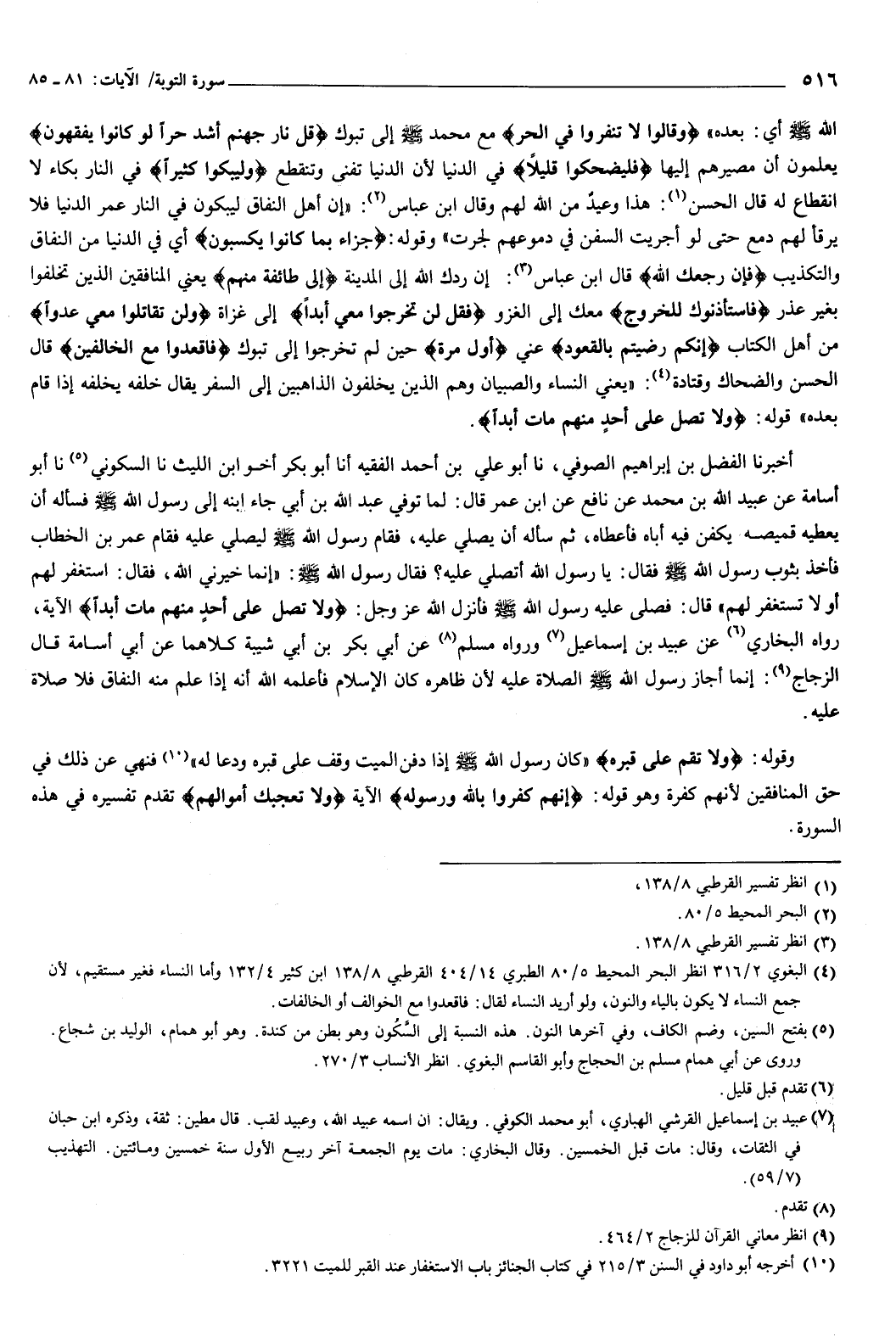 424 - أَخْبَرَنَا الْفَضْلُ بْنُ إِبْرَاهِيمَ الصُّوفِيُّ، نا أَبُو عَلِيِّ بْنُ أَحْمَدَ الْفَقِيهُ، أنا أَبُو بَكْرٍ أَخُو ابْنِ اللَّيْثِ، نا السَّكُونِيُّ، نا أَبُو أُسَامَةَ، عَنْ عُبَيْدِ اللَّهِ بْنِ مُحَمَّدٍ، عَنْ نَافِعٍ، عَنِ ابْنِ عُمَرَ، قَالَ: لَمَّا تُوُفِّيَ عَبْدُ اللَّهِ بْنُ أُبَيٍّ جَاءَ ابْنُهُ إِلَى رَسُولِ اللَّهِ صَلَّى اللهُ عَلَيْهِ وَسَلَّمَ فَسَأَلَهُ أَنْ يُعْطِيَهُ قَمِيصَهُ يُكَفِّنُ فِيهِ أَبَاهُ فَأَعْطَاهُ، ثُمَّ سَأَلَهُ أَنْ يُصَلِّيَ عَلَيْهِ، فَقَامَ رَسُولُ اللَّهِ صَلَّى اللهُ عَلَيْهِ وَسَلَّمَ لِيُصَلِّيَ عَلَيْهِ فَقَامَ عُمَرُ بْنُ الْخَطَّابِ فَأَخَذَ بِثَوْبِ رَسُولِ اللَّهِ صَلَّى اللهُ عَلَيْهِ وَسَلَّمَ فَقَالَ: يَا رَسُولَ اللَّهِ أَتُصَلِّي عَلَيْهِ؟ فقَالَ رَسُولُ اللَّهِ صَلَّى اللهُ عَلَيْهِ وَسَلَّمَ: " إِنَّمَا خَيَّرَنِي اللَّهُ، فَقَالَ: اسْتَغْفِرْ لَهُمْ أَوْ لا تَسْتَغْفِرْ لَهُمْ " قَالَ: فَصَلَّى عَلَيْهِ رَسُولُ اللَّهِ صَلَّى اللهُ عَلَيْهِ وَسَلَّمَ فَأَنْزَلَ اللَّهُ عَزَّ وَجَلَّ {وَلا تُصَلِّ عَلَى أَحَدٍ مِنْهُمْ مَاتَ أَبَدًا} [التوبة: 84] الآيَةَ.
