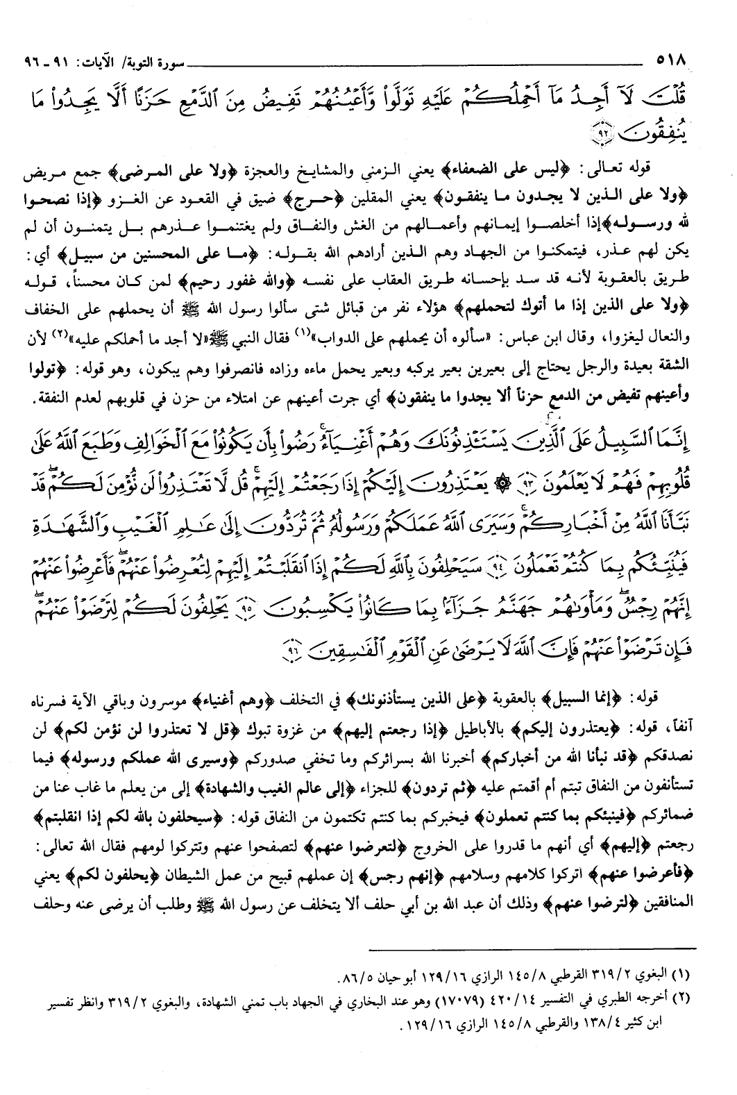 قُلْتَ لا أَجِدُ مَا أَحْمِلُكُمْ عَلَيْهِ تَوَلَّوْا وَأَعْيُنُهُمْ تَفِيضُ مِنَ الدَّمْعِ حَزَنًا أَلَّا يَجِدُوا مَا يُنْفِقُونَ {92} } [التوبة: 91-92] قوله تعالى: {لَيْسَ عَلَى الضُّعَفَاءِ} [التوبة: 91] يعني الزمني والمشايخ والعجزة، {وَلا عَلَى الْمَرْضَى} [التوبة: 91] جمع مريض، {وَلا عَلَى الَّذِينَ لا يَجِدُونَ مَا يُنْفِقُونَ} [التوبة: 91] يعني المقلين، {حَرَجٌ} [التوبة: 91] ضيق في القعود عن الغزو، {إِذَا نَصَحُوا لِلَّهِ وَرَسُولِهِ} [التوبة: 91] إذا أخلصوا إيمانهم وأعمالهم من الغش والنفاق، ولم يغتنموا عذرهم بل يتمنون أن لم يكن لهم عذر، فيتمكنوا من الجهاد، وهم الذين أرادهم الله بقوله: {مَا عَلَى الْمُحْسِنِينَ مِنْ سَبِيلٍ} [التوبة: 91] أي: طريق بالعقوبة لأنه قد سد بإحسانه طريق العذاب على نفسه، {وَاللَّهُ غَفُورٌ رَحِيمٌ} [التوبة: 91] لمن كان محسنا.