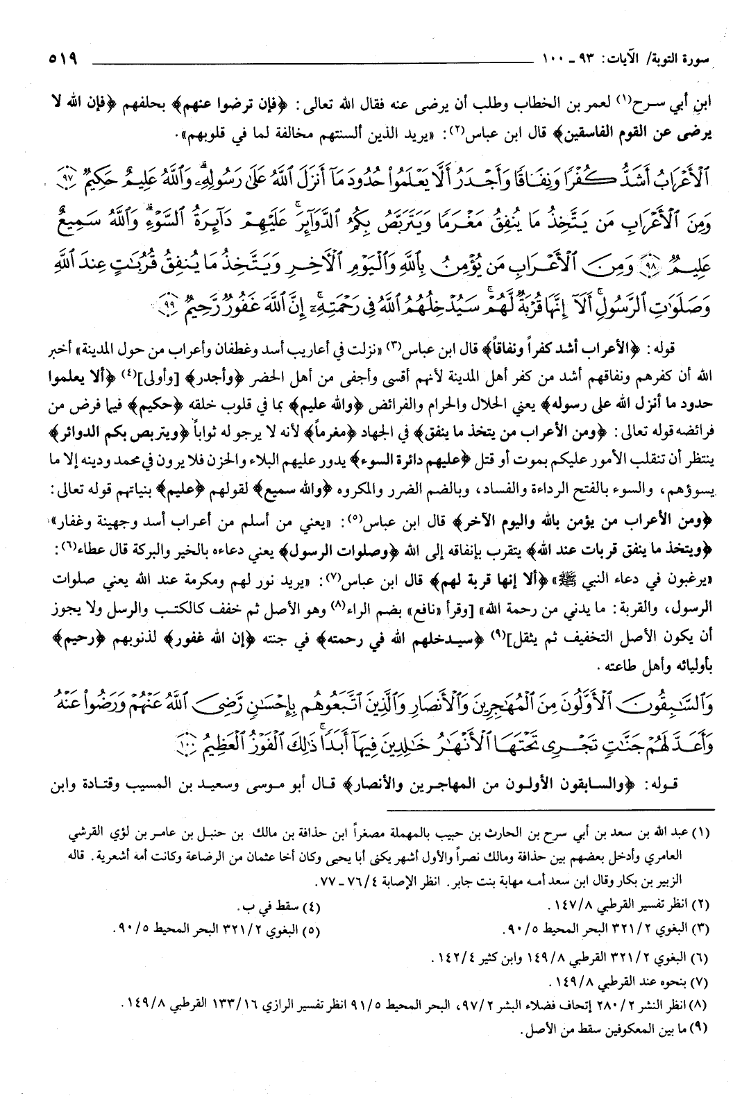 {وَالسَّابِقُونَ الأَوَّلُونَ مِنَ الْمُهَاجِرِينَ وَالأَنْصَارِ وَالَّذِينَ اتَّبَعُوهُمْ بِإِحْسَانٍ رَضِيَ اللَّهُ عَنْهُمْ وَرَضُوا عَنْهُ وَأَعَدَّ لَهُمْ جَنَّاتٍ تَجْرِي تَحْتَهَا الأَنْهَارُ خَالِدِينَ فِيهَا أَبَدًا ذَلِكَ الْفَوْزُ الْعَظِيمُ} [التوبة: 100] قوله: {وَالسَّابِقُونَ الأَوَّلُونَ مِنَ الْمُهَاجِرِينَ وَالأَنْصَارِ} [التوبة: 100] قال أبو موسى، وسعيد بن المسيب، وقتادة، وابن