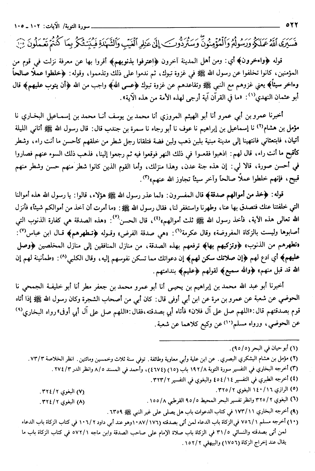 فَسَيَرَى اللَّهُ عَمَلَكُمْ وَرَسُولُهُ وَالْمُؤْمِنُونَ وَسَتُرَدُّونَ إِلَى عَالِمِ الْغَيْبِ وَالشَّهَادَةِ فَيُنَبِّئُكُمْ بِمَا كُنْتُمْ تَعْمَلُونَ {105} } [التوبة: 102-105] قوله: وَآخَرُونَ أي: ومن أهل المدينة آخرون اعْتَرَفُوا بِذُنُوبِهِمْ أقروا بها عن معرفة، نزلت في قوم من المؤمنين كانوا تخلفوا عن رسول الله صَلَّى اللهُ عَلَيْهِ وَسَلَّمَ في غزوة تبوك، ثم ندموا على ذلك وتذمموا، وقوله: {خَلَطُوا عَمَلا صَالِحًا وَآخَرَ سَيِّئًا} [التوبة: 102] يعني: غزوهم مع النبي صَلَّى اللهُ عَلَيْهِ وَسَلَّمَ وتقاعدهم عن غزوة تبوك، عَسَى الله واجب من الله، {أَنْ يَتُوبَ عَلَيْهِمْ} [التوبة: 102] قال أبو عثمان النهدي: ما في القرآن آية أرجى لهذه الأمة من هذه الآية.