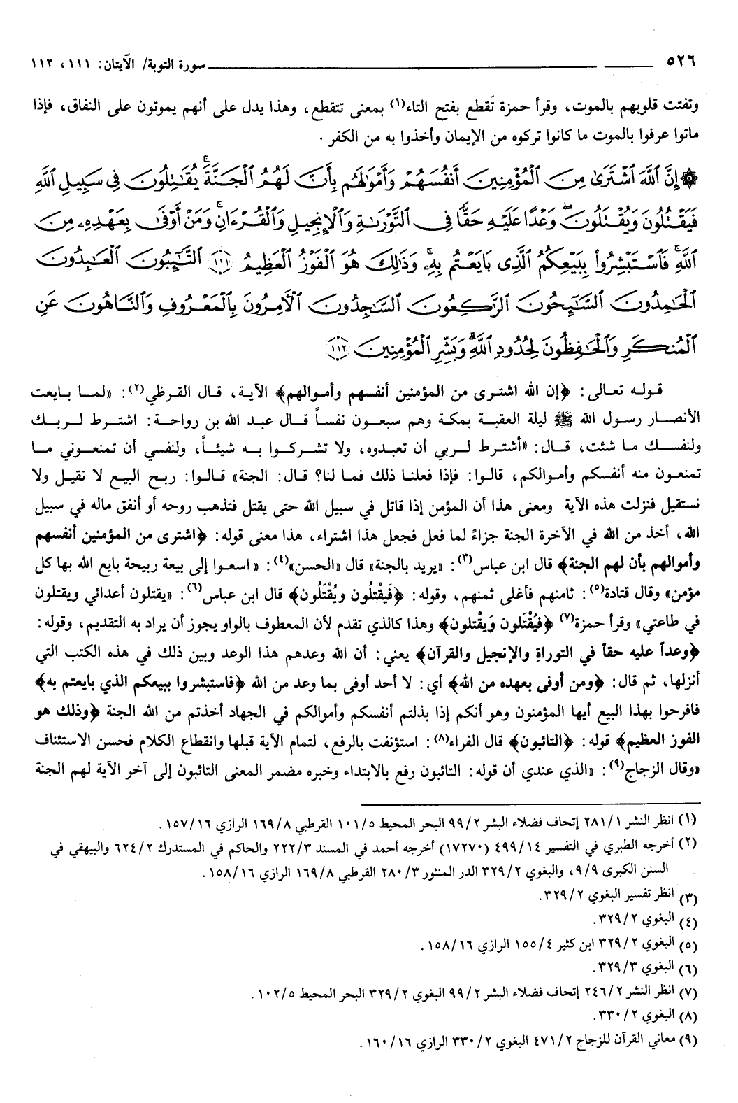 {إِنَّ اللَّهَ اشْتَرَى مِنَ الْمُؤْمِنِينَ أَنْفُسَهُمْ وَأَمْوَالَهُمْ بِأَنَّ لَهُمُ الْجَنَّةَ يُقَاتِلُونَ فِي سَبِيلِ اللَّهِ فَيَقْتُلُونَ وَيُقْتَلُونَ وَعْدًا عَلَيْهِ حَقًّا فِي التَّوْرَاةِ وَالإِنْجِيلِ وَالْقُرْءَانِ وَمَنْ أَوْفَى بِعَهْدِهِ مِنَ اللَّهِ فَاسْتَبْشِرُوا بِبَيْعِكُمُ الَّذِي بَايَعْتُمْ بِهِ وَذَلِكَ هُوَ الْفَوْزُ الْعَظِيمُ {111} التَّائِبُونَ الْعَابِدُونَ الْحَامِدُونَ السَّائِحُونَ الرَّاكِعُونَ السَّاجِدُونَ الآمِرُونَ بِالْمَعْرُوفِ وَالنَّاهُونَ عَنِ الْمُنْكَرِ وَالْحَافِظُونَ لِحُدُودِ اللَّهِ وَبَشِّرِ الْمُؤْمِنِينَ {112} } [التوبة: 111-112] قوله تعالى: {إِنَّ اللَّهَ اشْتَرَى مِنَ الْمُؤْمِنِينَ أَنْفُسَهُمْ وَأَمْوَالَهُمْ} [التوبة: 111] الآية: قال القرظي: لما بايعت الأنصار رسول الله صَلَّى اللهُ عَلَيْهِ وَسَلَّمَ ليلة العقبة بمكة، وهم سبعون نفسا، قال عبد الله بن رواحة: اشترط لربك ولنفسك ما شئت.