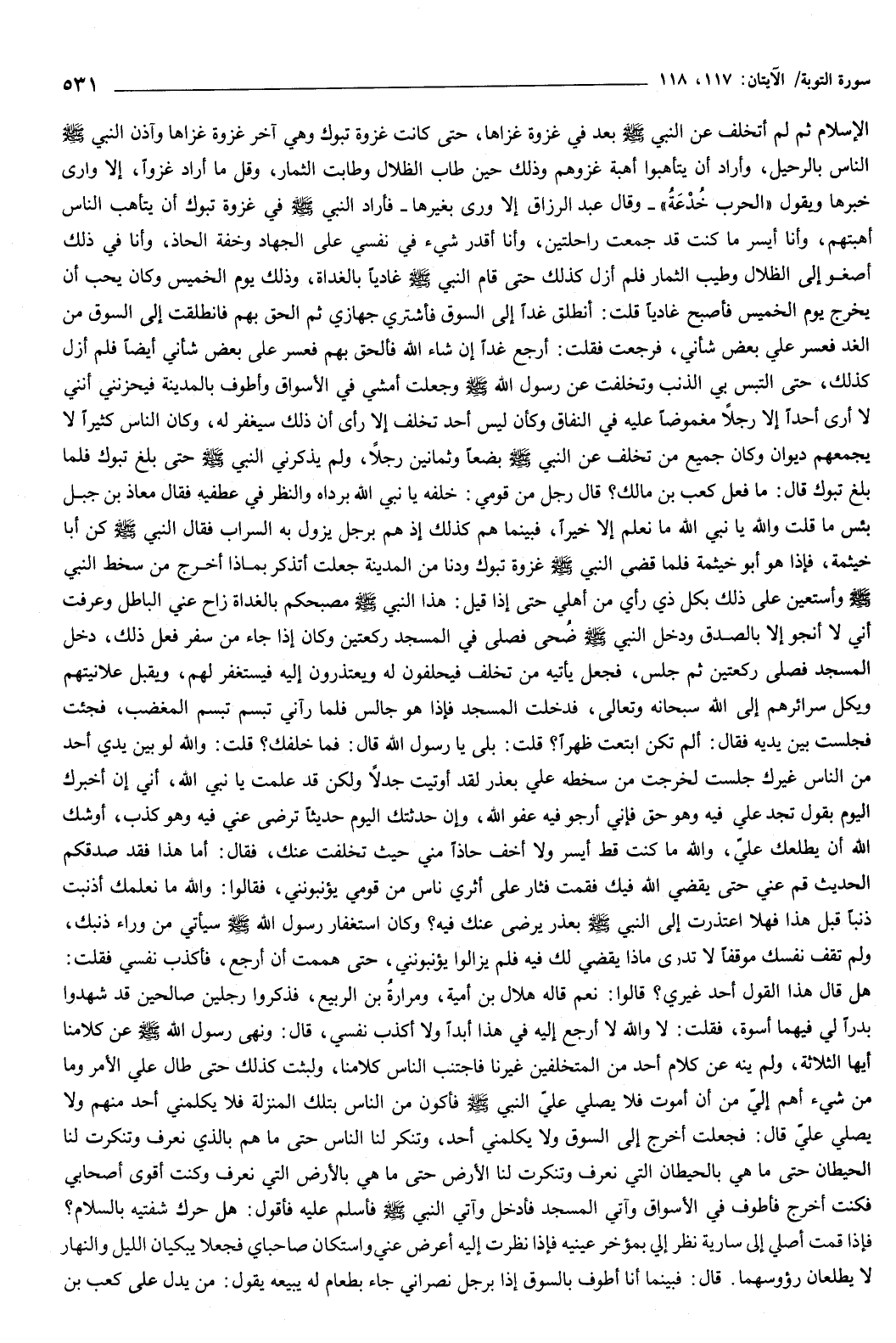 الإِسْلامِ ثُمَّ لَمْ أَتَخَلَّفْ عَنِ النَّبِيِّ صَلَّى اللهُ عَلَيْهِ وَسَلَّمَ بَعْدُ فِي غَزْوَةٍ غَزَاهَا، حَتَّى كَانَتْ غَزْوَةُ تَبُوكَ وَهِيَ آخِرُ غَزْوَةٍ غَزَاهَا وَآذَنَ النَّبِيُّ صَلَّى اللهُ عَلَيْهِ وَسَلَّمَ النَّاسَ بِالرَّحِيلِ، وَأَرَادَ أَنْ يَتَأَهَّبُوا أُهْبَةَ غَزْوِهِمْ وَذَلِكَ حِينَ طَابَ الظِّلالُ وَطَابَتِ الثِّمَارُ، وَقَلَّ مَا أَرَادَ غَزْوًا، إِلَّا وَارَى خَبَرَهَا وَيَقُولُ: الْحَرْبُ خُدْعَةٌ، وَقَالَ عَبْدُ الرَّزَّاقِ: إِلَّا وَرَّى بِغَيْرِهَا، فَأَرَادَ النَّبِيُّ صَلَّى اللهُ عَلَيْهِ وَسَلَّمَ فِي غَزْوَةِ تَبُوكَ أَنْ يَتَأَهَّبَ النَّاسُ أُهْبَتَهُمْ، وَأَنَا أَيْسَرُ مَا كُنْتُ قَدْ جَمَعْتُ رَاحِلَتَيْنِ، وَأَنَا أَقْدَرُ شَيْءٍ فِي نَفْسِي عَلَى الْجِهَادِ وَخِفَّةِ الْحَاذ ِ، وَأَنَا فِي ذَلِكَ أَصْغُو إِلَى الظِّلالِ وَطِيبِ الثِّمَارِ فَلَمْ أَزَلْ كَذَلِكَ حَتَّى قَامَ النَّبِيُّ صَلَّى اللهُ عَلَيْهِ وَسَلَّمَ غَادِيًا بِالْغَدَاةِ، وَذَلِكَ يَوْمَ الْخَمِيسَ، وَكَانَ يُحِبُّ أَنْ يَخْرُجَ يَوْمَ الْخَمِيسِ فَأَصْبَحَ غَادِيًا، قُلْتُ: أَنْطَلِقُ غَدًا إِلَى السُّوقِ فَأَشْتَرِي جِهَازِي ثَمَّ أَلْحَقُ بِهِمْ فَانْطَلَقْتُ إِلَى السُّوقِ مِنَ الْغَدِ فَعَسُرَ عَلَيَّ بَعْضُ شَأْنِي، فَرَجَعْتُ، فَقُلْتُ: أَرْجِعُ غَدًا إِنْ شَاءَ اللَّهُ فَأَلْحَقُ بِهِمْ فَعَسُرَ عَلَيَّ بَعْضُ شَأْنِي أَيْضًا فَلَمْ أَزَلْ كَذَلِكَ، حَتَّى الْتَبَسَ بِي الذَّنْبُ وَتَخَلَّفْتُ عَنْ رَسُولِ اللَّهِ صَلَّى اللهُ عَلَيْهِ وَسَلَّمَ وَجَعَلْتُ أَمْشِي فِي الأَسْوَاقِ وَأَطُوفُ بِالْمَدِينَةِ فَيُحْزِنُنِي أَنَّنِي لا أَرَى أَحَدًا إِلَّا رَجُلا مَغْمُوضًا عَلَيْهِ فِي النِّفَاقِ وَكَأَنَّ لَيْسَ أَحَدٌ تَخَلَّفَ إِلَّا رَأَى أَنَّ ذَلِكَ سَيُغْفَرُ لَهُ، وَكَانَ النَّاسُ كَثِيرًا لا يَجْمَعُهُمْ دِيوَانٌ وَكَانَ جَمِيعُ مَنْ تَخَلَّفَ عَنِ النَّبِيِّ صَلَّى اللهُ عَلَيْهِ وَسَلَّمَ بِضْعًا وَثَمَانِينَ رَجُلا، وَلَمْ يَذْكُرْنِي النَّبِيُّ صَلَّى اللهُ عَلَيْهِ وَسَلَّمَ حَتَّى بَلَغَ تَبُوكَ فَلَمَّا بَلَغَ تَبُوكَ قَالَ: مَا فَعَلَ كَعْبُ بْنُ مَالِكٍ؟ قَالَ رَجُلٌ مِنْ قَوْمِي: خَلَّفَهُ يَا نَبِيَّ اللَّهِ بُرْدَاهُ وَالَّنَظَرُ فِي عِطْفَيْهِ، فَقَالَ مُعَاذُ بْنُ جَبَلٍ: بِئْسَ مَا قُلْتَ وَاللَّهِ يَا نَبِيَّ اللَّهِ مَا نَعْلَمُ إِلَّا خَيْرًا، فَبَيْنَمَا هُمْ كَذَلِكَ إِذْ هُمْ بِرَجُلٍ يَزُولُ بِهِ السَّرَابُ، فَقَالَ النَّبِيُّ صَلَّى اللهُ عَلَيْهِ وَسَلَّمَ: كُنْ أَبَا خَيْثَمَةَ، فَإِذَا هُوَ أَبُو خَيْثَمَةَ فَلَمَّا قَضَى النَّبِيُّ صَلَّى اللهُ عَلَيْهِ وَسَلَّمَ غَزْوَةَ تَبُوكَ وَدَنَا مِنَ الْمَدِينَةِ جَعَلْتُ أَتَذَكَّرُ بِمَاذَا أَخْرُجُ مِنْ سَخَطِ النَّبِيِّ صَلَّى اللهُ عَلَيْهِ وَسَلَّمَ وَأَسْتَعِينُ عَلَى ذَلِكَ بِكُلِّ ذِي رَأْيٍ مِنْ أَهْلِي حَتَّى إِذَا قِيلَ: هَذَا النَّبِيُّ صَلَّى اللهُ عَلَيْهِ وَسَلَّمَ مُصَبِّحُكُمْ بِالْغَدَاةِ زَاحَ عَنِّي الْبَاطِلُ وَعَرَفْتُ أَنِّي لا أَنْجُو إِلَّا بِالصِّدْقِ وَدَخَلَ النَّبِيُّ صَلَّى اللهُ عَلَيْهِ وَسَلَّمَ ضُحًى فَصَلَّى فِي الْمَسْجِدِ رَكْعَتَيْنِ، وَكَانَ إِذَا جَاءَ مِنْ سَفَرٍ فَعَلَ ذَلِكَ، دَخَلَ الْمَسْجِدَ فَصَلَّى رَكْعَتَيْنِ ثُمَّ جَلَسَ، فَجَعَلَ يَأْتِيهِ مَنْ تَخَلَّفَ فَيَحْلِفُونَ لَهُ وَيَعْتَذِرُونَ إِلَيْهِ فَيَسْتَغْفِرُ لَهُمْ، وَيَقْبَلُ عَلانِيَتَهُمْ وَيَكِلُ سَرَائِرَهُمْ إِلَى اللَّهِ سُبْحَانَهُ وَتَعَالَى، فَدَخَلْتُ الْمَسْجِدَ فَإِذَا هُوَ جَالِسٌ فَلَمَّا رَآنِي تَبَسَّمَ تَبَسُّمَ الْمُغْ