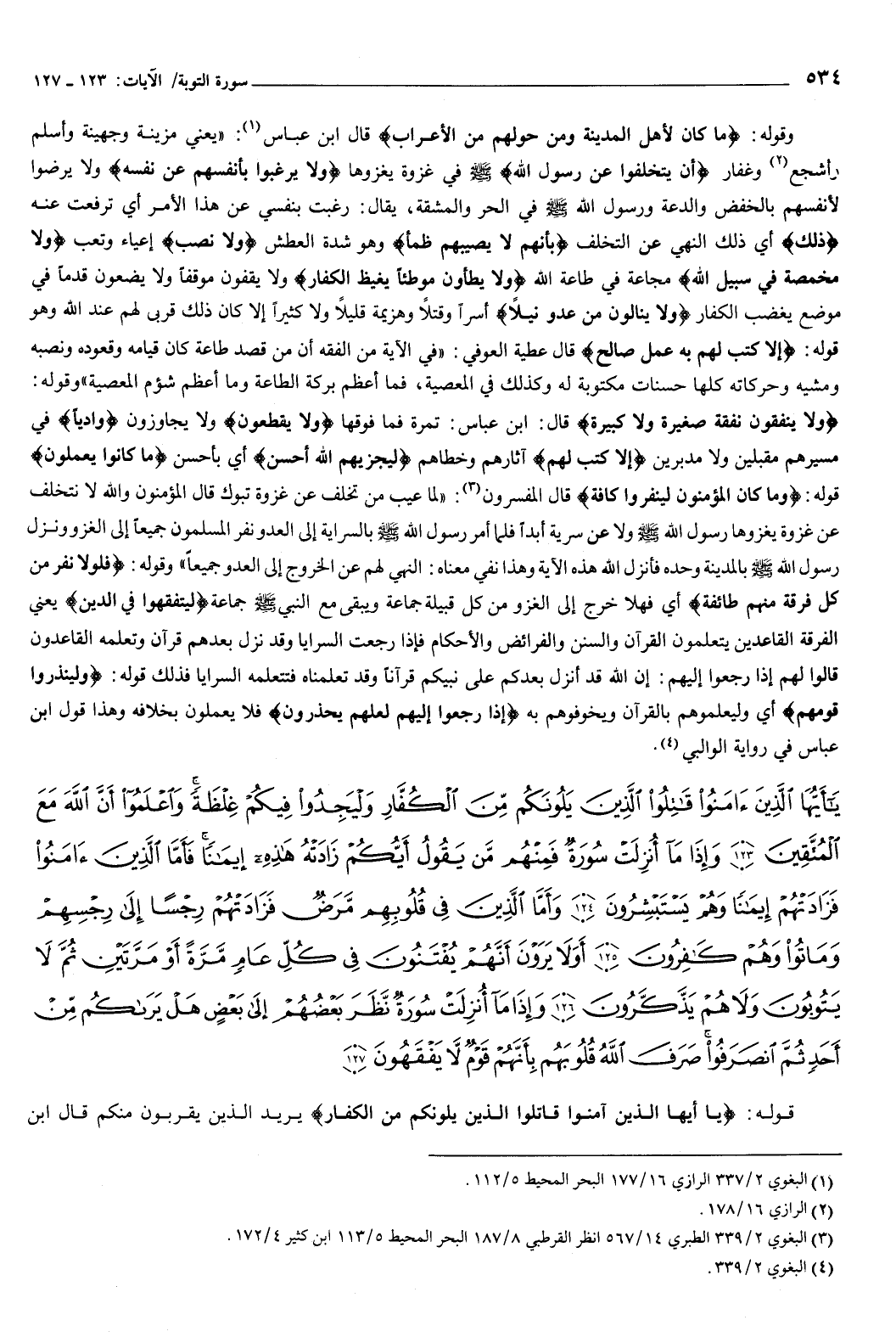 {يَأَيُّهَا الَّذِينَ آمَنُوا قَاتِلُوا الَّذِينَ يَلُونَكُمْ مِنَ الْكُفَّارِ وَلْيَجِدُوا فِيكُمْ غِلْظَةً وَاعْلَمُوا أَنَّ اللَّهَ مَعَ الْمُتَّقِينَ {123} وَإِذَا مَا أُنْزِلَتْ سُورَةٌ فَمِنْهُمْ مَنْ يَقُولُ أَيُّكُمْ زَادَتْهُ هَذِهِ إِيمَانًا فَأَمَّا الَّذِينَ آمَنُوا فَزَادَتْهُمْ إِيمَانًا وَهُمْ يَسْتَبْشِرُونَ {124} وَأَمَّا الَّذِينَ فِي قُلُوبِهِمْ مَرَضٌ فَزَادَتْهُمْ رِجْسًا إِلَى رِجْسِهِمْ وَمَاتُوا وَهُمْ كَافِرُونَ {125} أَوَلا يَرَوْنَ أَنَّهُمْ يُفْتَنُونَ فِي كُلِّ عَامٍ مَرَّةً أَوْ مَرَّتَيْنِ ثُمَّ لا يَتُوبُونَ وَلا هُمْ يَذَّكَّرُونَ {126} وَإِذَا مَا أُنْزِلَتْ سُورَةٌ نَظَرَ بَعْضُهُمْ إِلَى بَعْضٍ هَلْ يَرَاكُمْ مِنْ أَحَدٍ ثُمَّ انْصَرَفُوا صَرَفَ اللَّهُ قُلُوبَهُمْ بِأَنَّهُمْ قَوْمٌ لا يَفْقَهُونَ {127} } [التوبة: 123-127] قوله: {يَأَيُّهَا الَّذِينَ آمَنُوا قَاتِلُوا الَّذِينَ يَلُونَكُمْ مِنَ الْكُفَّارِ} [التوبة: 123] يريد الذين يقربون منكم، قال ابن