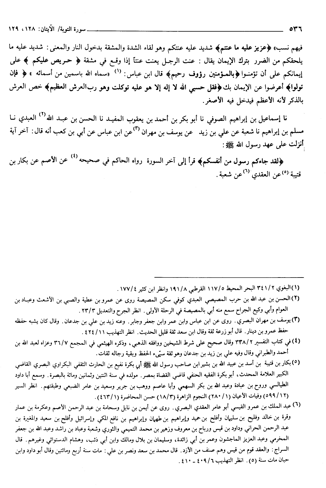 436 - نا إِسْمَاعِيلُ بْنُ إِبْرَاهِيمَ الصُّوفِيُّ، نا أَبُو بَكْرِ بْنُ أَحْمَدَ بْنِ يَعْقُوبَ الْمُفِيدُ، نا الْحَسَنُ بْنُ عَبْدِ اللَّهِ الْعَبْدِيُّ، نا مُسْلِمُ بْنُ إِبْرَاهِيمَ، نا شُعْبَةُ، عَنْ عَلِيِّ بْنِ زَيْدٍ، عَنْ يُوسُفَ بْنِ مِهْرَانَ، عَنِ ابْنِ عَبَّاسٍ، عَنْ أُبَيِّ بْنِ كَعْبٍ، أَنَّهُ قَالَ: آخِرُ آيَةٍ أُنْزِلَتْ عَلَى عَهْدِ رَسُولِ اللَّهِ صَلَّى اللهُ عَلَيْهِ وَسَلَّمَ {لَقَدْ جَاءَكُمْ رَسُولٌ مِنْ أَنْفُسِكُمْ} [التوبة: 128] قَرَأَ إِلَى آخِرِ السُّورَةِ.
