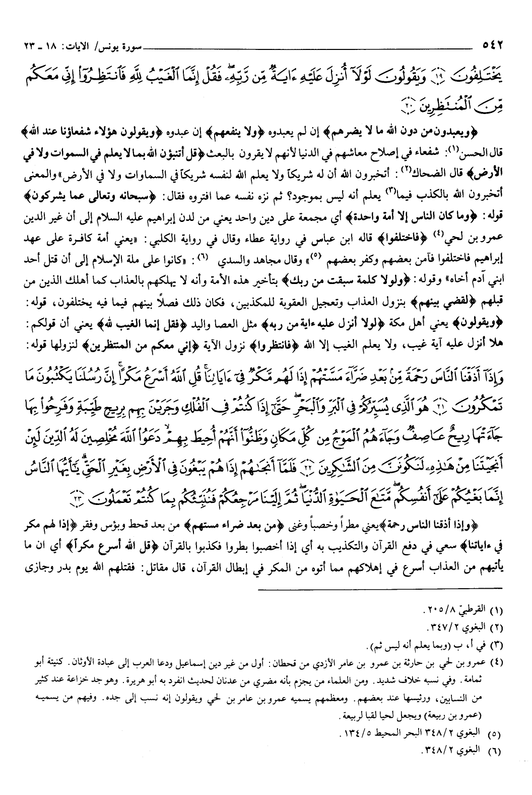 يَخْتَلِفُونَ {19} وَيَقُولُونَ لَوْلا أُنْزِلَ عَلَيْهِ آيَةٌ مِنْ رَبِّهِ فَقُلْ إِنَّمَا الْغَيْبُ لِلَّهِ فَانْتَظِرُوا إِنِّي مَعَكُمْ مِنَ الْمُنْتَظِرِينَ {20} } [يونس: 18-20] {وَيَعْبُدُونَ مِنْ دُونِ اللَّهِ مَا لا يَضُرُّهُمْ} [يونس: 18] إن لم يعبدوه، وَلا يَنْفَعُهُمْ إن عبدوه، {وَيَقُولُونَ هَؤُلاءِ شُفَعَاؤُنَا عِنْدَ اللَّهِ} [يونس: 18] قال الحسن: شفعاء في إصلاح معاشهم في الدنيا، لأنهم لا يقرون بالبعث.
