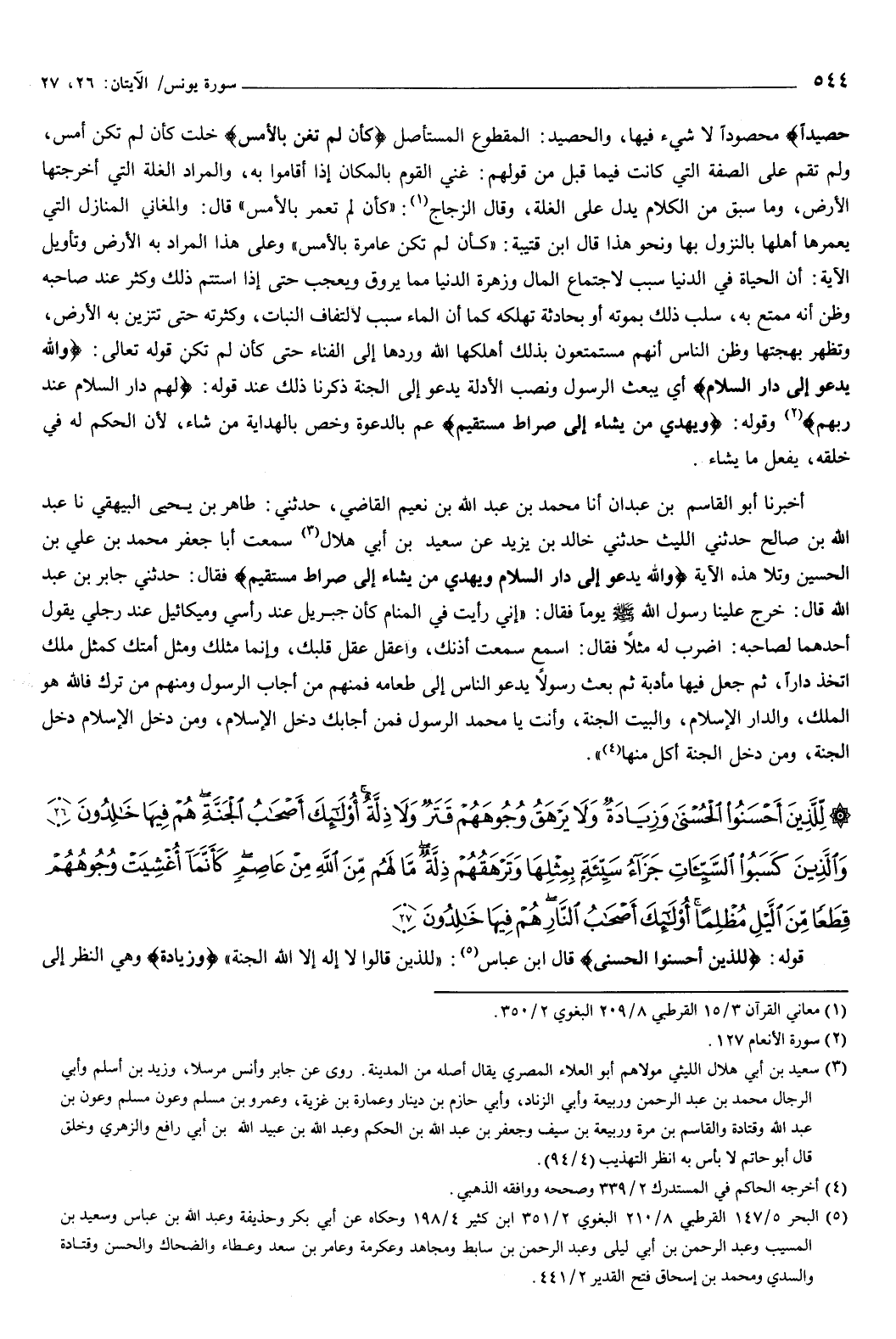 وعلى هذا المراد به الأرض وتأويل الآية: أن الحياة في الدنيا سبب لاجتماع المال وزهرة الدنيا مما يروق ويعجب حتى إذا استتم ذلك وكثر عند صاحبه وظن أنه ممتع به، سلب ذلك بموته أو بحادثة تهلكه كما أن الماء سبب لالتفاف النبات، وكثرته حتى تتزين به الأرض وتظهر بهجتها، وظن الناس أنهم مستمتعون بذلك أهلكها الله وردها إلى الفناء حتى كأن لم تكن، قوله تعالى: {وَاللَّهُ يَدْعُو إِلَى دَارِ السَّلامِ} [يونس: 25] أي: يبعث الرسول، ونصب الأدلة يدعو إلى الجنة، ذكرنا ذلك عند قوله: {لَهُمْ دَارُ السَّلامِ عِنْدَ رَبِّهِمْ} [الأنعام: 127] ، وقوله: {وَيَهْدِي مَنْ يَشَاءُ إِلَى صِرَاطٍ مُسْتَقِيمٍ} [يونس: 25] عم بالدعوة وخص بالهداية من شاء، لأن الحكم له في خلقه يفعل ما يشاء.