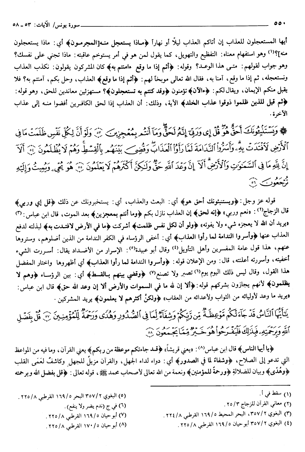 {وَيَسْتَنْبِئُونَكَ أَحَقٌّ هُوَ قُلْ إِي وَرَبِّي إِنَّهُ لَحَقٌّ وَمَا أَنْتُمْ بِمُعْجِزِينَ {53} وَلَوْ أَنَّ لِكُلِّ نَفْسٍ ظَلَمَتْ مَا فِي الأَرْضِ لافْتَدَتْ بِهِ وَأَسَرُّوا النَّدَامَةَ لَمَّا رَأَوُا الْعَذَابَ وَقُضِيَ بَيْنَهُمْ بِالْقِسْطِ وَهُمْ لا يُظْلَمُونَ {54} أَلا إِنَّ لِلَّهِ مَا فِي السَّمَوَاتِ وَالأَرْضِ أَلا إِنَّ وَعْدَ اللَّهِ حَقٌّ وَلَكِنَّ أَكْثَرَهُمْ لا يَعْلَمُونَ {55} هُوَ يُحْيِي وَيُمِيتُ وَإِلَيْهِ تُرْجَعُونَ {56} } [يونس: 53-56] قوله عز وجل: {وَيَسْتَنْبِئُونَكَ أَحَقٌّ هُوَ} [يونس: 53] أي: البعث والعذاب، أي: يستخبرونك عن ذلك، {قُلْ إِي وَرَبِّي} [يونس: 53] قال الزجاج: نعم وربي، إِنَّهُ لَحَقٌّ إن العذاب نازل بكم، {وَمَا أَنْتُمْ بِمُعْجِزِينَ} [يونس: 53] بعد الموت، قال ابن عباس: يريد أن الله لا يعجزه شيء ولا يفوته.