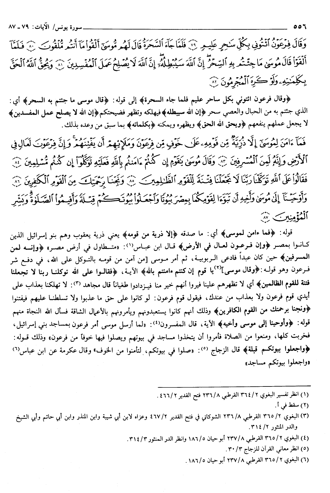 {فَمَا آمَنَ لِمُوسَى إِلا ذُرِّيَّةٌ مِنْ قَوْمِهِ عَلَى خَوْفٍ مِنْ فِرْعَوْنَ وَمَلَئِهِمْ أَنْ يَفْتِنَهُمْ وَإِنَّ فِرْعَوْنَ لَعَالٍ فِي الأَرْضِ وَإِنَّهُ لَمِنَ الْمُسْرِفِينَ {83} وَقَالَ مُوسَى يَا قَوْمِ إِنْ كُنْتُمْ آمَنْتُمْ بِاللَّهِ فَعَلَيْهِ تَوَكَّلُوا إِنْ كُنْتُمْ مُسْلِمِينَ {84} فَقَالُوا عَلَى اللَّهِ تَوَكَّلْنَا رَبَّنَا لا تَجْعَلْنَا فِتْنَةً لِلْقَوْمِ الظَّالِمِينَ {85} وَنَجِّنَا بِرَحْمَتِكَ مِنَ الْقَوْمِ الْكَافِرِينَ {86} وَأَوْحَيْنَا إِلَى مُوسَى وَأَخِيهِ أَنْ تَبَوَّءَا لِقَوْمِكُمَا بِمِصْرَ بُيُوتًا وَاجْعَلُوا بُيُوتَكُمْ قِبْلَةً وَأَقِيمُوا الصَّلاةَ وَبَشِّرِ الْمُؤْمِنِينَ {87} } [يونس: 83-87] قوله: {فَمَا آمَنَ لِمُوسَى} [يونس: 83] أي: ما صدقه {إِلا ذُرِّيَّةٌ مِنْ قَوْمِهِ} [يونس: 83] يعني: ذرية يعقوب وهم بنو إسرائيل الذين كانوا بمصر {وَإِنَّ فِرْعَوْنَ لَعَالٍ فِي الأَرْضِ} [يونس: 83] قال ابن عباس: متطاول في أرض مصر، {وَإِنَّهُ لَمِنَ الْمُسْرِفِينَ} [يونس: 83] حين كان عبدا فادعى الربوبية، ثم أمر موسى: من آمن من قومه بالتوكل على الله في دفع شر فرعون، وهو قوله: {وَقَالَ مُوسَى يَا قَوْمِ إِنْ كُنْتُمْ آمَنْتُمْ بِاللَّهِ} [يونس: 84] الآية، {فَقَالُوا عَلَى اللَّهِ تَوَكَّلْنَا رَبَّنَا لا تَجْعَلْنَا فِتْنَةً لِلْقَوْمِ الظَّالِمِينَ} [يونس: 85] أي: لا تظهرهم علينا فيروا أنهم خير منا فيزدادوا طغيانا، قال مجاهد: لا تهلكنا بعذاب على أيدي قوم فرعون ولا بعذاب من عندك، فيقول قوم فرعون: لو كانوا على حق ما عذبوا ولا تسلطنا عليهم فيفتنوا.