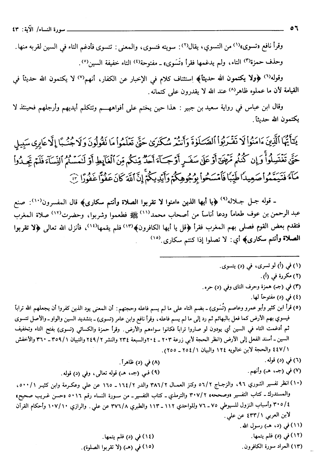 {يَأَيُّهَا الَّذِينَ آمَنُوا لا تَقْرَبُوا الصَّلاةَ وَأَنْتُمْ سُكَارَى حَتَّى تَعْلَمُوا مَا تَقُولُونَ وَلا جُنُبًا إِلا عَابِرِي سَبِيلٍ حَتَّى تَغْتَسِلُوا وَإِنْ كُنْتُمْ مَرْضَى أَوْ عَلَى سَفَرٍ أَوْ جَاءَ أَحَدٌ مِنْكُمْ مِنَ الْغَائِطِ أَوْ لامَسْتُمُ النِّسَاءَ فَلَمْ تَجِدُوا مَاءً فَتَيَمَّمُوا صَعِيدًا طَيِّبًا فَامْسَحُوا بِوُجُوهِكُمْ وَأَيْدِيكُمْ إِنَّ اللَّهَ كَانَ عَفُوًّا غَفُورًا} [النساء: 43] قوله جل جلاله: {يَأَيُّهَا الَّذِينَ آمَنُوا لا تَقْرَبُوا الصَّلاةَ وَأَنْتُمْ سُكَارَى} [النساء: 43] قال المفسرون: صنع عبد الرحمن بن عوف طعاما، ودعا أناسا من أصحاب محمد صَلَّى اللهُ عَلَيْهِ وَسَلَّمَ فطعموا وشربوا، وحضرت صلاة المغرب، فتقدم بعض القوم فصلى بهم المغرب، فقرأ: قل يأيها الكافرون فلم يقمها، فأنزل الله تعالى {لا تَقْرَبُوا الصَّلاةَ وَأَنْتُمْ سُكَارَى} [النساء: 43] أي: لا تصلوا إذا كنتم سكارى.