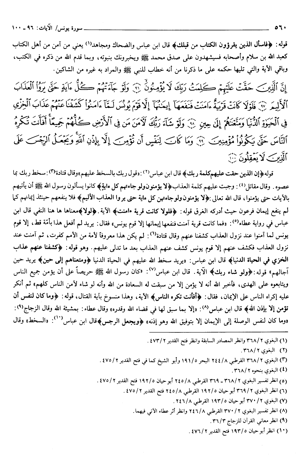 {إِنَّ الَّذِينَ حَقَّتْ عَلَيْهِمْ كَلِمَتُ رَبِّكَ لا يُؤْمِنُونَ {96} وَلَوْ جَاءَتْهُمْ كُلُّ آيَةٍ حَتَّى يَرَوُا الْعَذَابَ الأَلِيمَ {97} فَلَوْلا كَانَتْ قَرْيَةٌ آمَنَتْ فَنَفَعَهَا إِيمَانُهَا إِلا قَوْمَ يُونُسَ لَمَّا آمَنُوا كَشَفْنَا عَنْهُمْ عَذَابَ الْخِزْيِ فِي الْحَيَاةَ الدُّنْيَا وَمَتَّعْنَاهُمْ إِلَى حِينٍ {98} وَلَوْ شَاءَ رَبُّكَ لآمَنَ مَنْ فِي الأَرْضِ كُلُّهُمْ جَمِيعًا أَفَأَنْتَ تُكْرِهُ النَّاسَ حَتَّى يَكُونُوا مُؤْمِنِينَ {99} وَمَا كَانَ لِنَفْسٍ أَنْ تُؤْمِنَ إِلا بِإِذْنِ اللَّهِ وَيَجْعَلُ الرِّجْسَ عَلَى الَّذِينَ لا يَعْقِلُونَ {100} } [يونس: 96-100] قوله: {إِنَّ الَّذِينَ حَقَّتْ عَلَيْهِمْ كَلِمَتُ رَبِّكَ} [يونس: 96] قال ابن عباس: قول ربك بالسخط عليهم.