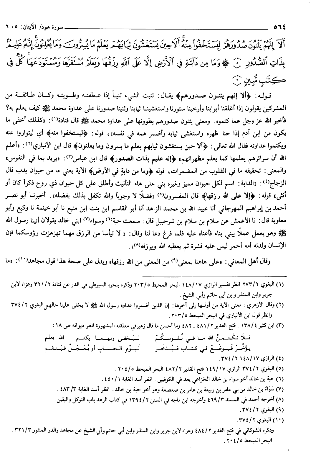 {أَلا إِنَّهُمْ يَثْنُونَ صُدُورَهُمْ لِيَسْتَخْفُوا مِنْهُ أَلا حِينَ يَسْتَغْشُونَ ثِيَابَهُمْ يَعْلَمُ مَا يُسِرُّونَ وَمَا يُعْلِنُونَ إِنَّهُ عَلِيمٌ بِذَاتِ الصُّدُورِ {5} وَمَا مِنْ دَابَّةٍ فِي الأَرْضِ إِلا عَلَى اللَّهِ رِزْقُهَا وَيَعْلَمُ مُسْتَقَرَّهَا وَمُسْتَوْدَعَهَا كُلٌّ فِي كِتَابٍ مُبِينٍ {6} } [هود: 5-6] قوله: {أَلا إِنَّهُمْ يَثْنُونَ صُدُورَهُمْ} [هود: 5] يقال: ثنيت الشيء ثنيا إذا عطفته وطويته، وكان طائفة من المشركين يقولون: إذا أغلقنا أبوابنا، وأرخينا ستورنا، واستغشينا ثيابنا، وثنينا صدورنا على عداوة محمد صَلَّى اللهُ عَلَيْهِ وَسَلَّمَ كيف يعلم به؟ فأخبر الله عز وجل عما كتموه.