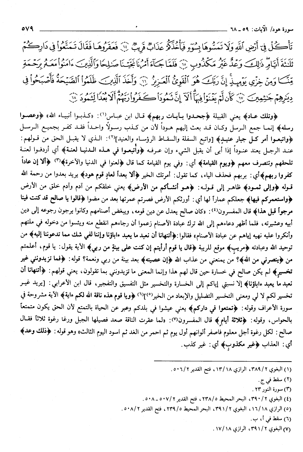 تَأْكُلْ فِي أَرْضِ اللَّهِ وَلا تَمَسُّوهَا بِسُوءٍ فَيَأْخُذَكُمْ عَذَابٌ قَرِيبٌ {64} فَعَقَرُوهَا فَقَالَ تَمَتَّعُوا فِي دَارِكُمْ ثَلاثَةَ أَيَّامٍ ذَلِكَ وَعْدٌ غَيْرُ مَكْذُوبٍ {65} فَلَمَّا جَاءَ أَمْرُنَا نَجَّيْنَا صَالِحًا وَالَّذِينَ آمَنُوا مَعَهُ بِرَحْمَةٍ مِنَّا وَمِنْ خِزْيِ يَوْمِئِذٍ إِنَّ رَبَّكَ هُوَ الْقَوِيُّ الْعَزِيزُ {66} وَأَخَذَ الَّذِينَ ظَلَمُوا الصَّيْحَةُ فَأَصْبَحُوا فِي دِيَارِهِمْ جَاثِمِينَ {67} كَأَنْ لَمْ يَغْنَوْا فِيهَا أَلا إِنَّ ثَمُودَ كَفَرُوا رَبَّهُمْ أَلا بُعْدًا لِثَمُودَ {68} } [هود: 59-68] وَتِلْكَ عَادٌ يعني القبيلة {جَحَدُوا بِآيَاتِ رَبِّهِمْ} [هود: 59] قال ابن عباس: كذبوا أنبياء الله.