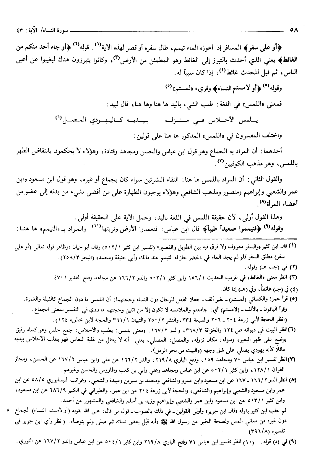 {أَوْ عَلَى سَفَرٍ} [النساء: 43] المسافر إذا أعوزه الماء تيمم، طال سفره أو قصر لهذه الآية، قوله {أَوْ جَاءَ أَحَدٌ مِنْكُمْ مِنَ الْغَائِطِ} [النساء: 43] يعني الذي أحدث بالتبرز إلى الغائط وهو المطمئن من الأرض، وكانوا يتبرزون هناك ليغيبوا عن أعين الناس، ثم قيل للحدث غائط، إذا كان سببا له.
