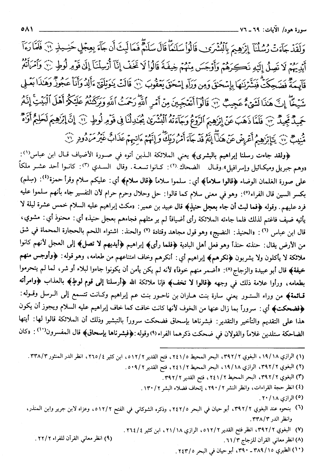 وَلَقَدْ جَاءَتْ رُسُلُنَا إِبْرَاهِيمَ بِالْبُشْرَى قَالُوا سَلامًا قَالَ سَلامٌ فَمَا لَبِثَ أَنْ جَاءَ بِعِجْلٍ حَنِيذٍ {69} فَلَمَّا رَأَى أَيْدِيَهُمْ لا تَصِلُ إِلَيْهِ نَكِرَهُمْ وَأَوْجَسَ مِنْهُمْ خِيفَةً قَالُوا لا تَخَفْ إِنَّا أُرْسِلْنَا إِلَى قَوْمِ لُوطٍ {70} وَامْرَأَتُهُ قَائِمَةٌ فَضَحِكَتْ فَبَشَّرْنَاهَا بِإِسْحَاقَ وَمِنْ وَرَاءِ إِسْحَاقَ يَعْقُوبَ {71} قَالَتْ يَا وَيْلَتَا أَأَلِدُ وَأَنَا عَجُوزٌ وَهَذَا بَعْلِي شَيْخًا إِنَّ هَذَا لَشَيْءٌ عَجِيبٌ {72} قَالُوا أَتَعْجَبِينَ مِنْ أَمْرِ اللَّهِ رَحْمَتُ اللَّهِ وَبَرَكَاتُهُ عَلَيْكُمْ أَهْلَ الْبَيْتِ إِنَّهُ حَمِيدٌ مَجِيدٌ {73} فَلَمَّا ذَهَبَ عَنْ إِبْرَاهِيمَ الرَّوْعُ وَجَاءَتْهُ الْبُشْرَى يُجَادِلُنَا فِي قَوْمِ لُوطٍ {74} إِنَّ إِبْرَاهِيمَ لَحَلِيمٌ أَوَّاهٌ مُنِيبٌ {75} يَا إِبْرَاهِيمُ أَعْرِضْ عَنْ هَذَا إِنَّهُ قَدْ جَاءَ أَمْرُ رَبِّكَ وَإِنَّهُمْ آتِيهِمْ عَذَابٌ غَيْرُ مَرْدُودٍ {76} } [هود: 69-76] {وَلَقَدْ جَاءَتْ رُسُلُنَا إِبْرَاهِيمَ بِالْبُشْرَى} [هود: 69] يعني الملائكة الذين أتوه في صورة الأضياف، قال ابن عباس: وهم جبريل وميكائيل وإسرافيل.