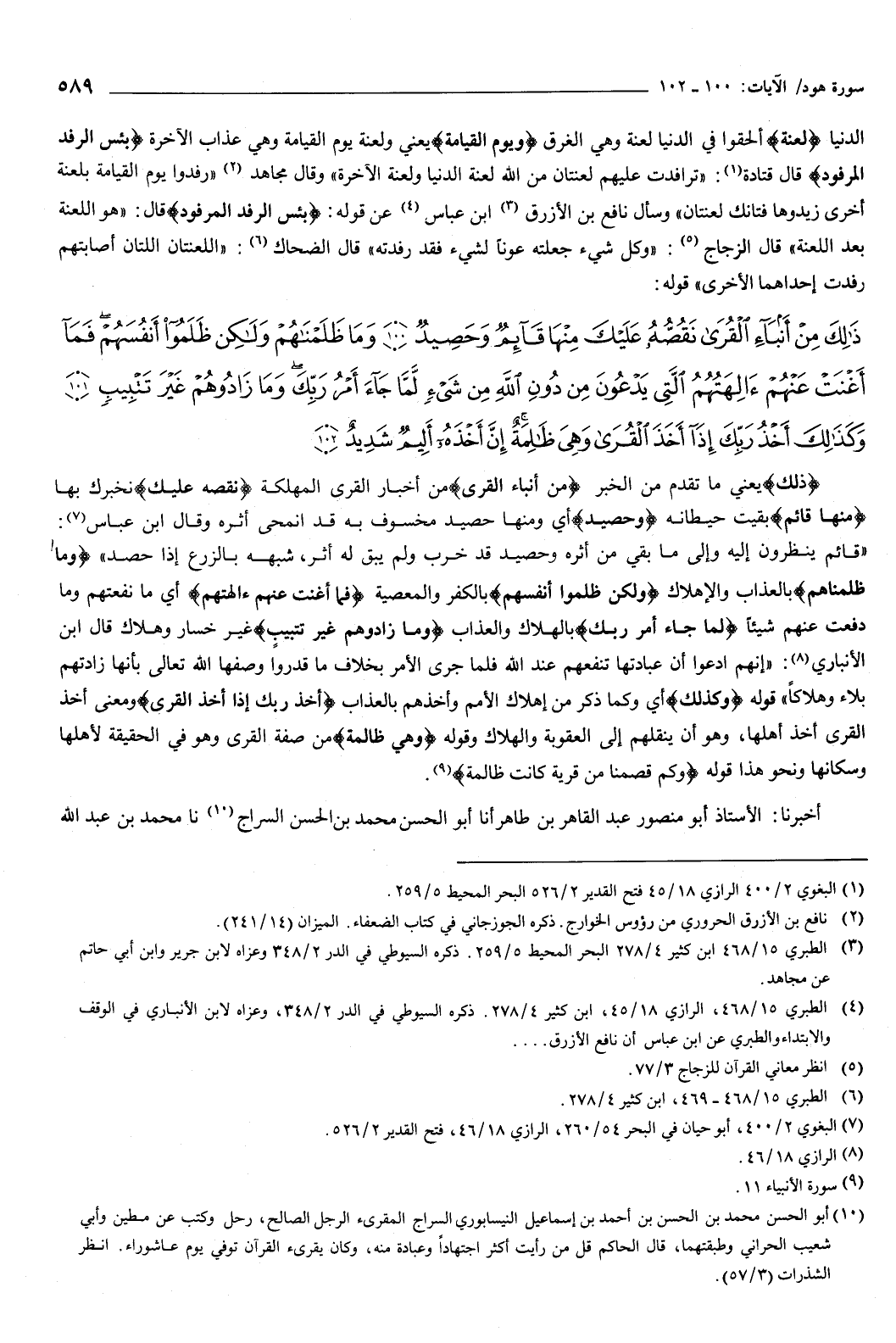 قوله: {ذَلِكَ مِنْ أَنْبَاءِ الْقُرَى نَقُصُّهُ عَلَيْكَ مِنْهَا قَائِمٌ وَحَصِيدٌ {100} وَمَا ظَلَمْنَاهُمْ وَلَكِنْ ظَلَمُوا أَنْفُسَهُمْ فَمَا أَغْنَتْ عَنْهُمْ آلِهَتُهُمُ الَّتِي يَدْعُونَ مِنْ دُونِ اللَّهِ مِنْ شَيْءٍ لَمَّا جَاءَ أَمْرُ رَبِّكَ وَمَا زَادُوهُمْ غَيْرَ تَتْبِيبٍ {101} وَكَذَلِكَ أَخْذُ رَبِّكَ إِذَا أَخَذَ الْقُرَى وَهِيَ ظَالِمَةٌ إِنَّ أَخْذَهُ أَلِيمٌ شَدِيدٌ {102} } [هود: 100-102] ذَلِكَ يعني ما تقدم من الخبر {مِنْ أَنْبَاءِ الْقُرَى} [هود: 100] من أخبار القرى الهالكة نَقُصُّهُ عَلَيْكَ نخبرك بها مِنْهَا قَائِمٌ بقيت حيطانه وَحَصِيدٌ أي: ومنها حصيد مخسوف به قد انمحى أثره، وقال ابن عباس: قائم ينظرون إليه وإلى ما بقى من أثره، وحصيد قد خرب ولم يبق له أثر، شبهه بالزرع إذا حصد.