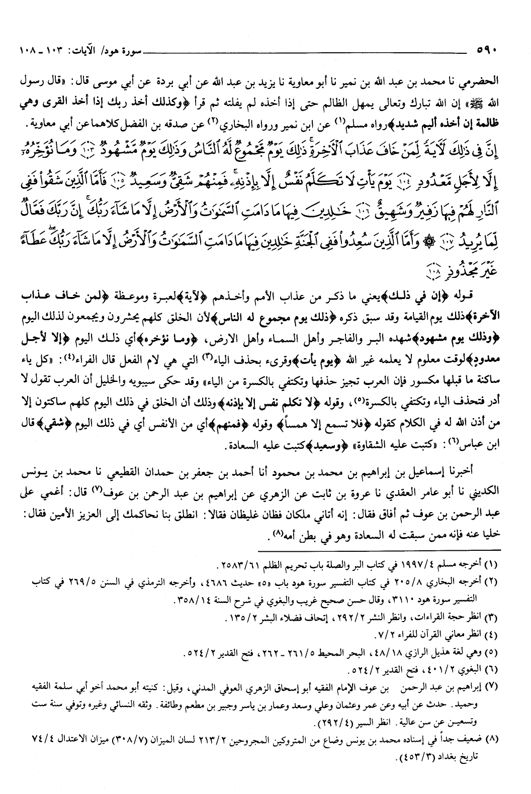 {إِنَّ فِي ذَلِكَ لآيَةً لِمَنْ خَافَ عَذَابَ الآخِرَةِ ذَلِكَ يَوْمٌ مَجْمُوعٌ لَهُ النَّاسُ وَذَلِكَ يَوْمٌ مَشْهُودٌ {103} وَمَا نُؤَخِّرُهُ إِلا لأَجَلٍ مَعْدُودٍ {104} يَوْمَ يَأْتِ لا تَكَلَّمُ نَفْسٌ إِلا بِإِذْنِهِ فَمِنْهُمْ شَقِيٌّ وَسَعِيدٌ {105} فَأَمَّا الَّذِينَ شَقُوا فَفِي النَّارِ لَهُمْ فِيهَا زَفِيرٌ وَشَهِيقٌ {106} خَالِدِينَ فِيهَا مَا دَامَتِ السَّمَوَاتُ وَالأَرْضُ إِلا مَا شَاءَ رَبُّكَ إِنَّ رَبَّكَ فَعَّالٌ لِمَا يُرِيدُ {107} وَأَمَّا الَّذِينَ سُعِدُوا فَفِي الْجَنَّةِ خَالِدِينَ فِيهَا مَا دَامَتِ السَّمَوَاتُ وَالأَرْضُ إِلا مَا شَاءَ رَبُّكَ عَطَاءً غَيْرَ مَجْذُوذٍ {108} } [هود: 103-108] قوله: {إِنَّ فِي ذَلِكَ} [هود: 103] يعني ما ذكر من عذاب الأمم وأخذهم لآيَةً لعبرة وموعظة {لِمَنْ خَافَ عَذَابَ الآخِرَةِ} [هود: 103] ذلك يوم القيامة وقد سبق ذكره {ذَلِكَ يَوْمٌ مَجْمُوعٌ لَهُ النَّاسُ} [هود: 103] لأن الخلق كلهم يحشرون ويجمعون لذلك اليوم {وَذَلِكَ يَوْمٌ مَشْهُودٌ} [هود: 103] شهده البر والفاجر، وأهل السماء وأهل الأرض، وَمَا نُؤَخِّرُهُ أي: ذلك اليوم {إِلا لأَجَلٍ مَعْدُودٍ} [هود: 104] لوقت معلوم لا يعلمه غير الله، يَوْمَ يَأْتِي، وقرئ بحذف الياء التي هي لام الفعل، قال الفراء: كل ياء ساكنة ما قبلها مكسور فإن العرب تجيز حذفها وتكتفي بالكسرة من الياء.