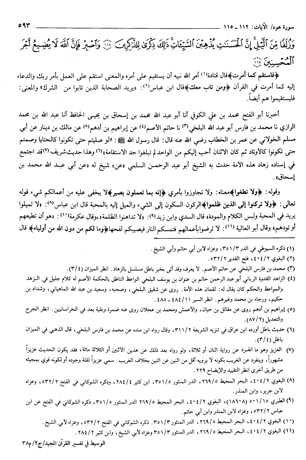 وَزُلَفًا مِنَ اللَّيْلِ إِنَّ الْحَسَنَاتِ يُذْهِبْنَ السَّيِّئَاتِ ذَلِكَ ذِكْرَى لِلذَّاكِرِينَ {114} وَاصْبِرْ فَإِنَّ اللَّهَ لا يُضِيعُ أَجْرَ الْمُحْسِنِينَ {115} } [هود: 112-115] {فَاسْتَقِمْ كَمَا أُمِرْتَ} [هود: 112] قال قتادة: أمر الله نبيه أن يستقيم على أمره.
