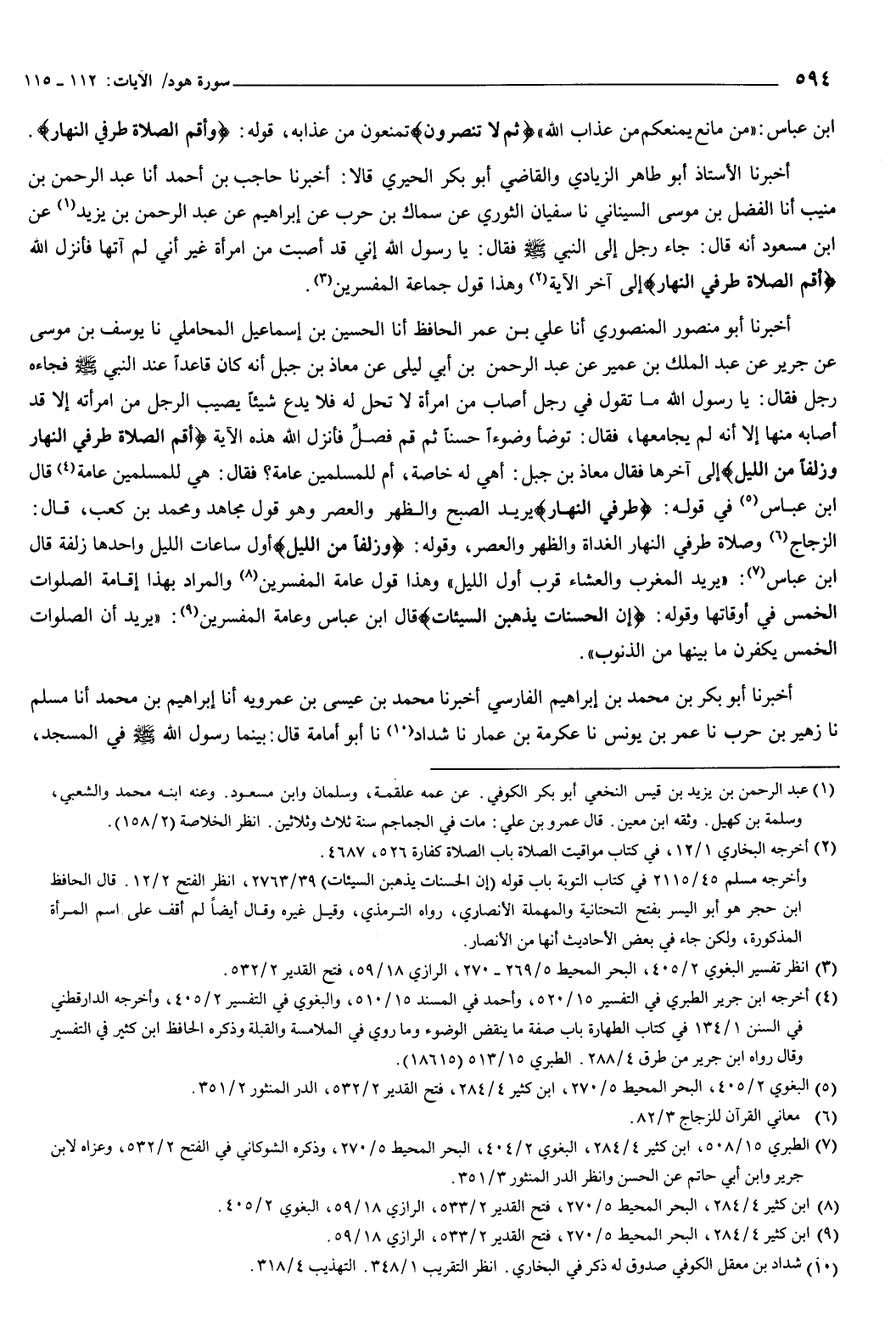 458 - أَخْبَرَنَا الأُسْتَاذُ أَبُو طَاهِرٍ الزِّيَادِيُّ، وَالْقَاضِي أَبُو بَكْرٍ الْحِيرِيُّ، قَالا: أَخْبَرَنَا حَاجِبُ بْنُ أَحْمَدَ، أنا عَبْدُ الرَّحْمَنِ بْنُ مُنِيبٍ، أنا الْفَضْلُ بْنُ مُوسَى السِّينَانِيُّ، نا سُفْيَانُ الثَّوْرِيّ، عَنْ سِمَاكِ بْنِ حَرْبٍ، عَنْ إِبْرَاهِيمَ، عَنْ عَبْدِ الرَّحْمَنِ بْنِ يَزِيدَ، عَنِ ابْنِ مَسْعُودٍ، أَنَّهُ قَالَ: جَاءَ رَجُلٌ إِلَى النَّبِيِّ صَلَّى اللهُ عَلَيْهِ وَسَلَّمَ فَقَالَ: يَا رَسُولَ اللَّهِ إِنِّي قَدْ أَصَبْتُ مِنَ امْرَأَةٍ غَيْرَ أَنِّي لَمْ آتِهَا فَأَنْزَلَ اللَّهُ {وَأَقِمِ الصَّلاةَ طَرَفَيِ النَّهَارِ} [هود: 114] إِلَى آخِرِ الآيَةِ، وَهَذَا قَوْلُ جَمَاعَةِ الْمُفَسِّرِينَ