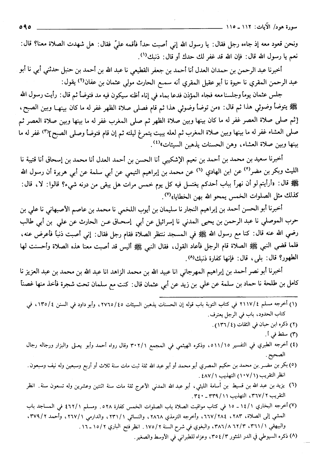 461 - أَخْبَرَنَا عَبْدُ الرَّحْمَنِ بْنُ حَمْدَانَ الْعَدْلُ، أنا أَحْمَدُ بْنُ جَعْفَرٍ الْقَطِيعِيُّ، نا عَبْدُ اللَّهِ بْنُ أَحْمَدَ بْنِ حَنْبَلٍ، حَدَّثَنِي أَبِي، نا أَبُو عَبْدِ الرَّحْمَنِ الْمُقْرِئُ، نا حَيْوَةُ، نا أَبُو عُقَيْلٍ الْمُقْرِئُ، أَنَّهُ سَمِعَ الْحَارِثَ مَوْلَى عُثْمَانَ بْنِ عَفَّانَ يَقُولُ: جَلَسَ عُثْمَانُ يَوْمًا وَجَلَسْنَا مَعَهُ فَجَاءَ الْمُؤَذِّنُ فَدَعَا بِمَاءٍ فِي إِنَاءٍ أَظُنُّهُ سَيَكُونُ فِيهِ مُدٌّ فَتَوَضَّأَ، ثُمَّ قَالَ: رَأَيْتُ رَسُولَ اللَّهِ يَتَوَضَّأُ وُضُوئِي هَذَا، ثُمَّ قَالَ: «مَنْ تَوَضَّأَ وُضُوئِي هَذَا ثُمَّ قَامَ فَصَلَّى صَلاةَ الظُّهْرِ غُفِرَ لَهُ مَا كَانَ بَيْنَهَا وَبَيْنَ الصُّبْحِ، ثُمَّ صَلَّى صَلاةَ الْعَصْرِ غُفِرَ لَهُ مَا كَانَ بَيْنَهَا وَبَيْنَ صَلاةِ الظُّهْرِ، ثُمَّ صَلَّى الْمَغْرِبَ غُفِرَ لَهُ مَا بَيْنَهَا وَبَيْنَ صَلاةِ الْعَصْرِ، ثُمَّ صَلَّى الْعِشَاءَ غُفِرَ لَهُ مَا بَيْنَهَا وَبَيْنَ صَلاةِ الْمَغْرِبِ، ثُمَّ لَعَلَّهُ يَبِيتُ يَتَمَرَّغُ لَيْلَتَهُ، ثُمَّ إِنْ قَامَ فَتَوَضَّأَ وَصَلَّى الصُّبْحَ غُفِرَ لَهُ مَا بَيْنَهَا وَبَيْنَ صَلاةِ الْعِشَاءِ، وَهُنَّ الْحَسَنَاتُ يُذْهِبْنَ السَّيِّئَاتِ»