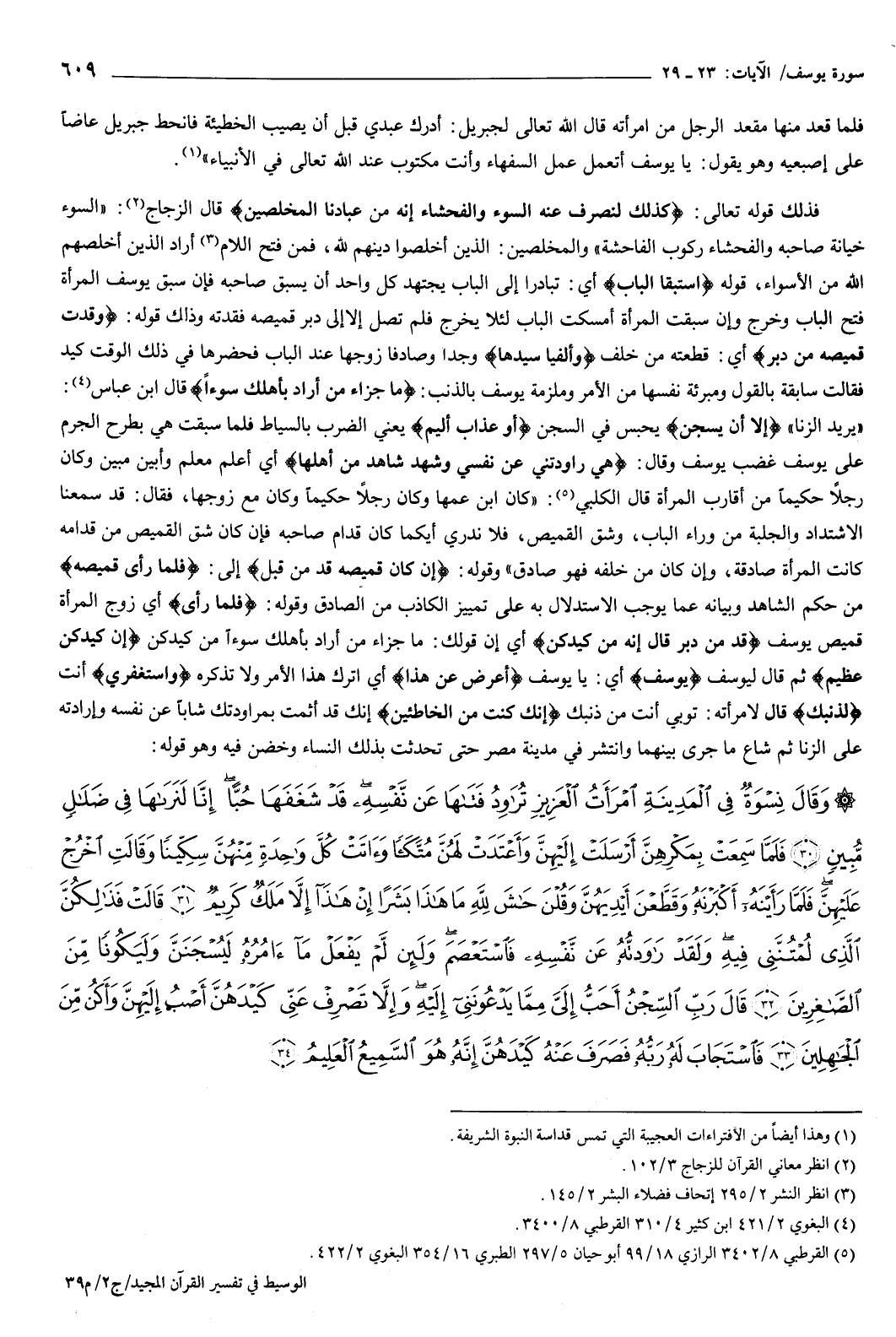 وقوله: {إِنْ كَانَ قَمِيصُهُ قُدَّ مِنْ قُبُلٍ} [يوسف: 26] إلى {فَلَمَّا رَأَى قَمِيصَهُ} [يوسف: 28] من حكم الشاهد وبيانه عما يوجب الاستدلال به على تمييز الكاذب من الصادق، وقوله: فلما رأى أي: زوج المرأة قميص يوسف {قُدَّ مِنْ دُبُرٍ قَالَ إِنَّهُ مِنْ كَيْدِكُنَّ} [يوسف: 28] أي: إن قولك: ما جزاء من أراد بأهلك سوءا من كيدكن {إِنَّ كَيْدَكُنَّ عَظِيمٌ} [يوسف: 28] ، ثم قال ليوسف يُوسُفُ أي: يا يوسف {أَعْرِضْ عَنْ هَذَا} [هود: 76] أي: اترك هذا الأمر ولا تذكره وَاسْتَغْفِرِي أنت لِذَنْبِكِ قال لامرأته: توبي أنت من ذنبك {إِنَّكِ كُنْتِ مِنَ الْخَاطِئِينَ} [يوسف: 29] إنك قد أثمت بمراودتك شابا عن نفسه وإرادته على الزنا، ثم شاع ما جرى بينهما وانتشر في مدينة مصر حتى تحدثت بذلك النساء وخضن فيه، وهو قوله: {وَقَالَ نِسْوَةٌ فِي الْمَدِينَةِ امْرَأَةُ الْعَزِيزِ تُرَاوِدُ فَتَاهَا عَنْ نَفْسِهِ قَدْ شَغَفَهَا حُبًّا إِنَّا لَنَرَاهَا فِي ضَلالٍ مُبِينٍ {30} فَلَمَّا سَمِعَتْ بِمَكْرِهِنَّ أَرْسَلَتْ إِلَيْهِنَّ وَأَعْتَدَتْ لَهُنَّ مُتَّكَأً وَآتَتْ كُلَّ وَاحِدَةٍ مِنْهُنَّ سِكِّينًا وَقَالَتِ اخْرُجْ عَلَيْهِنَّ فَلَمَّا رَأَيْنَهُ أَكْبَرْنَهُ وَقَطَّعْنَ أَيْدِيَهُنَّ وَقُلْنَ حَاشَ لِلَّهِ مَا هَذَا بَشَرًا إِنْ هَذَا إِلا مَلَكٌ كَرِيمٌ {31} قَالَتْ فَذَلِكُنَّ الَّذِي لُمْتُنَّنِي فِيهِ وَلَقَدْ رَاوَدْتُهُ عَنْ نَفْسِهِ فَاسْتَعْصَمَ وَلَئِنْ لَمْ يَفْعَلْ مَا آمُرُهُ لَيُسْجَنَنَّ وَلَيَكُونَنْ مِنَ الصَّاغِرِينَ {32} قَالَ رَبِّ السِّجْنُ أَحَبُّ إِلَيَّ مِمَّا يَدْعُونَنِي إِلَيْهِ وَإِلا تَصْرِفْ عَنِّي كَيْدَهُنَّ أَصْبُ إِلَيْهِنَّ وَأَكُنْ مِنَ الْجَاهِلِينَ {33} فَاسْتَجَابَ لَهُ رَبُّهُ فَصَرَفَ عَنْهُ كَيْدَهُنَّ إِنَّهُ هُوَ السَّمِيعُ الْعَلِيمُ {34} } [يوسف: 30-34] {