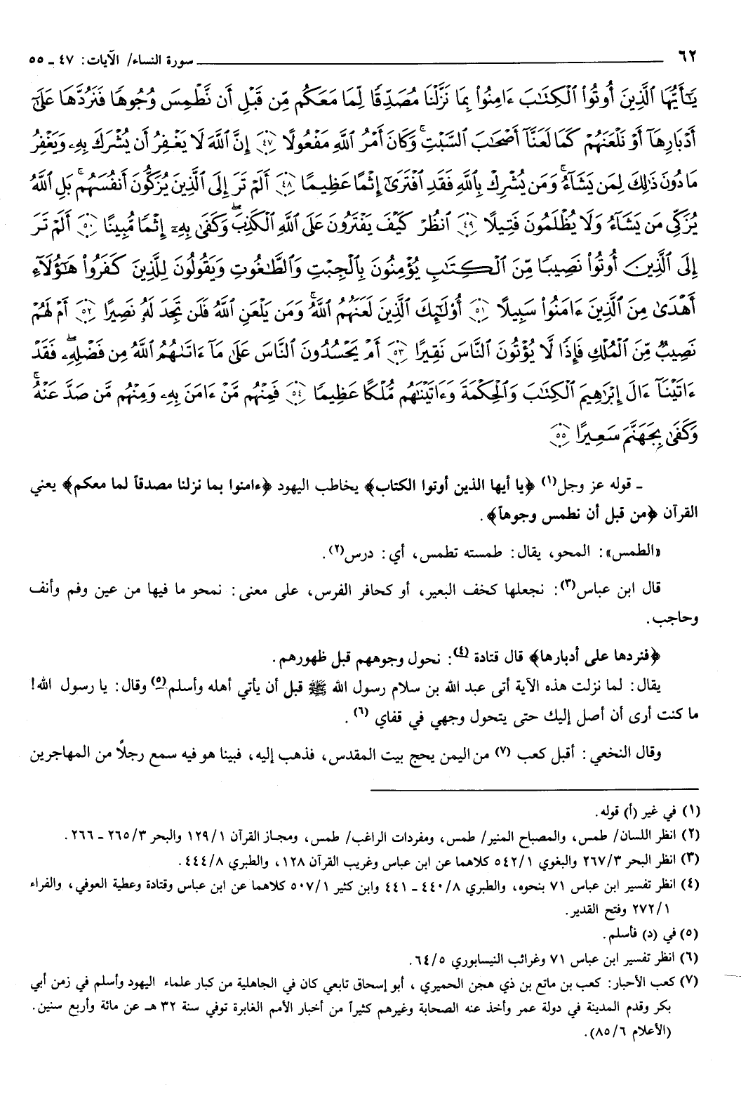 {يَأَيُّهَا الَّذِينَ أُوتُوا الْكِتَابَ آمِنُوا بِمَا نَزَّلْنَا مُصَدِّقًا لِمَا مَعَكُمْ مِنْ قَبْلِ أَنْ نَطْمِسَ وُجُوهًا فَنَرُدَّهَا عَلَى أَدْبَارِهَا أَوْ نَلْعَنَهُمْ كَمَا لَعَنَّا أَصْحَابَ السَّبْتِ وَكَانَ أَمْرُ اللَّهِ مَفْعُولا {47} إِنَّ اللَّهَ لا يَغْفِرُ أَنْ يُشْرَكَ بِهِ وَيَغْفِرُ مَا دُونَ ذَلِكَ لِمَنْ يَشَاءُ وَمَنْ يُشْرِكْ بِاللَّهِ فَقَدِ افْتَرَى إِثْمًا عَظِيمًا {48} أَلَمْ تَرَ إِلَى الَّذِينَ يُزَكُّونَ أَنْفُسَهُمْ بَلِ اللَّهُ يُزَكِّي مَنْ يَشَاءُ وَلا يُظْلَمُونَ فَتِيلا {49} انْظُرْ كَيْفَ يَفْتَرُونَ عَلَى اللَّهِ الْكَذِبَ وَكَفَى بِهِ إِثْمًا مُبِينًا {50} أَلَمْ تَرَ إِلَى الَّذِينَ أُوتُوا نَصِيبًا مِنَ الْكِتَابِ يُؤْمِنُونَ بِالْجِبْتِ وَالطَّاغُوتِ وَيَقُولُونَ لِلَّذِينَ كَفَرُوا هَؤُلاءِ أَهْدَى مِنَ الَّذِينَ آمَنُوا سَبِيلا {51} أُولَئِكَ الَّذِينَ لَعَنَهُمُ اللَّهُ وَمَنْ يَلْعَنِ اللَّهُ فَلَنْ تَجِدَ لَهُ نَصِيرًا {52} أَمْ لَهُمْ نَصِيبٌ مِنَ الْمُلْكِ فَإِذًا لا يُؤْتُونَ النَّاسَ نَقِيرًا {53} أَمْ يَحْسُدُونَ النَّاسَ عَلَى مَا آتَاهُمُ اللَّهُ مِنْ فَضْلِهِ فَقَدْ آتَيْنَا آلَ إِبْرَاهِيمَ الْكِتَابَ وَالْحِكْمَةَ وَآتَيْنَاهُمْ مُلْكًا عَظِيمًا {54} فَمِنْهُمْ مَنْ آمَنَ بِهِ وَمِنْهُمْ مَنْ صَدَّ عَنْهُ وَكَفَى بِجَهَنَّمَ سَعِيرًا {55} } [النساء: 47-55] قوله عز وجل: {يَأَيُّهَا الَّذِينَ أُوتُوا الْكِتَابَ} [النساء: 47] يخاطب اليهود، {آمِنُوا بِمَا نَزَّلْنَا مُصَدِّقًا لِمَا مَعَكُمْ} [النساء: 47] يعني القرآن {مِنْ قَبْلِ أَنْ نَطْمِسَ وُجُوهًا} [النساء: 47] .