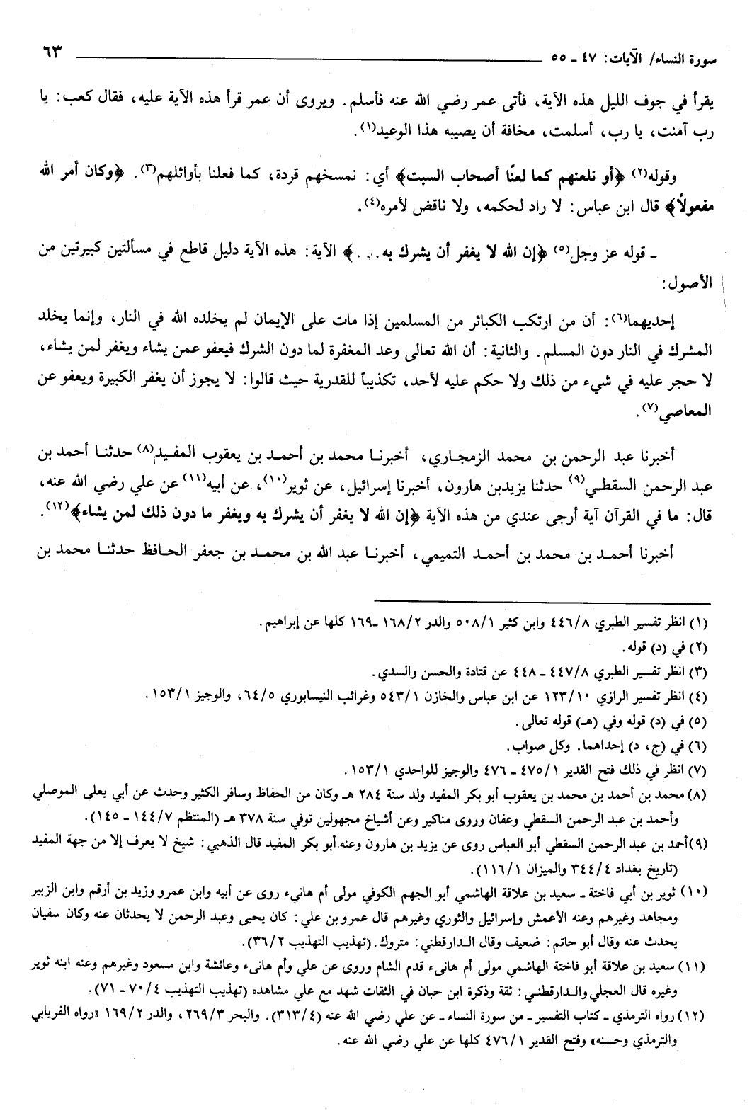 قوله عز وجل: {إِنَّ اللَّهَ لا يَغْفِرُ أَنْ يُشْرَكَ بِهِ} [النساء: 48] الآية، هذه الآية دليل قاطع في مسألتين كبيرتين من الأصول: إحديهما: أن من ارتكب الكبائر من المسلمين إذا مات على الإيمان لم يخلده الله في النار، وإنما يخلد المشرك في النار دون المسلم.