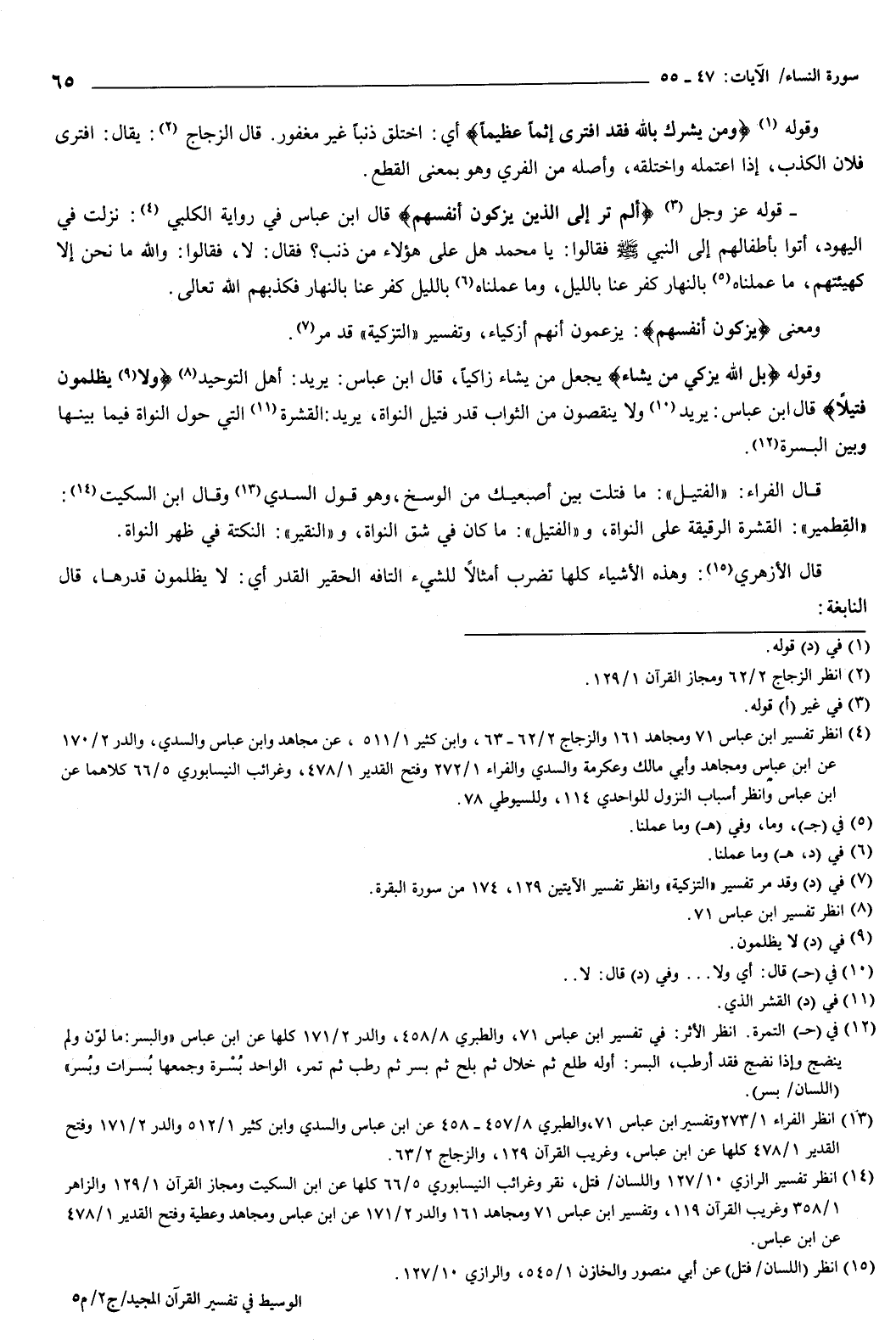 وقوله: {بَلِ اللَّهُ يُزَكِّي مَنْ يَشَاءُ} [النساء: 49] يجعل من يشاء زاكيا، قال ابن عباس: يريد: أهلَ التوحيد، {وَلا يُظْلَمُونَ فَتِيلا} [النساء: 49] قال ابن عباس: يريد: ولا ينقصون من الثواب قدر فتيل النواة، يريد القشرة التي حول النواة فيما بينها وبين البسرة.