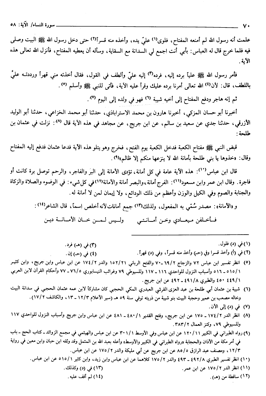 فلوى علي يده، وأخذه منه قسرا حتى دخل رسول الله صَلَّى اللهُ عَلَيْهِ وَسَلَّمَ البيت وصلى فيه فلما خرج قال له العباس: بأبي أنت اجمع لي السدانة مع السقاية، وسأله أن يعطيه المفتاح، فأنزل الله تعالى هذه الآية، فأمر رسول الله صَلَّى اللهُ عَلَيْهِ وَسَلَّمَ عليا برده إليه، فرده إليه عليّ وألطف في القول، فقال: أخذته مني قهرا ورددته علي باللطف، قال: لأن الله تعالى أمرنا برده إليك، وقرأ عليه الآية، فأتى للنبي صَلَّى اللهُ عَلَيْهِ وَسَلَّمَ، وأسلم، ثم إنه هاجر ودفع المفتاح إلى أخيه شيبة فهو في ولده إلى اليوم.