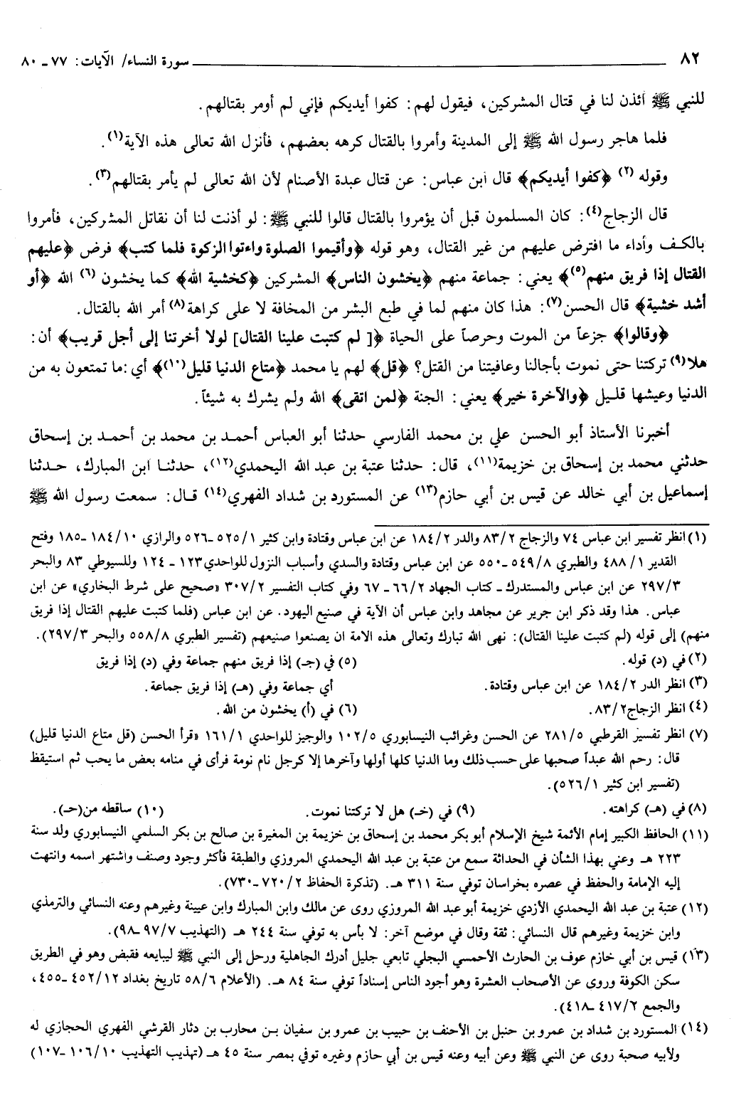 قال الزجاج: كان المسلمون قبل أن يؤمروا بالقتال قالوا للنبي صَلَّى اللهُ عَلَيْهِ وَسَلَّمَ: لو أذنت لنا أن نقاتل المشركين، فأمروا بالكف وأداء ما افترض عليهم من غير القتال، وهو قوله: {وَأَقِيمُوا الصَّلاةَ وَآتُوا الزَّكَاةَ فَلَمَّا كُتِبَ} [النساء: 77] فُرض {عَلَيْهِمُ الْقِتَالُ إِذَا فَرِيقٌ مِنْهُمْ} [النساء: 77] يعني: جماعة منهم، يخشون الناس: المشركين، كخشية الله: كما يخشون الله، {أَوْ أَشَدَّ خَشْيَةً} [النساء: 77] قال الحسن: هذا كان منهم لما في طبع البشر من المخافة لا على كراهة أمر الله بالقتال.