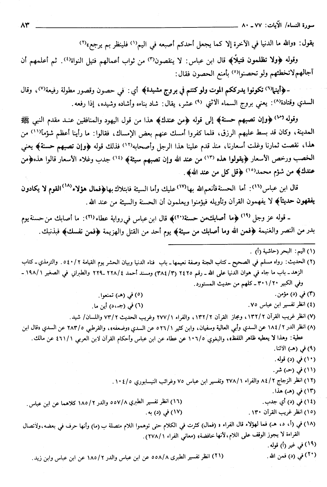 قال ابن عباس: أما الحسنة فأنعم الله بها عليك وأما السيئة فابتلاك بها، {فَمَالِ هَؤُلاءِ الْقَوْمِ لا يَكَادُونَ يَفْقَهُونَ حَدِيثًا} [النساء: 78] لا يفهمون القرآن وتأويله فيؤمنوا ويعلمون أن الحسنة والسيئة من عند الله.