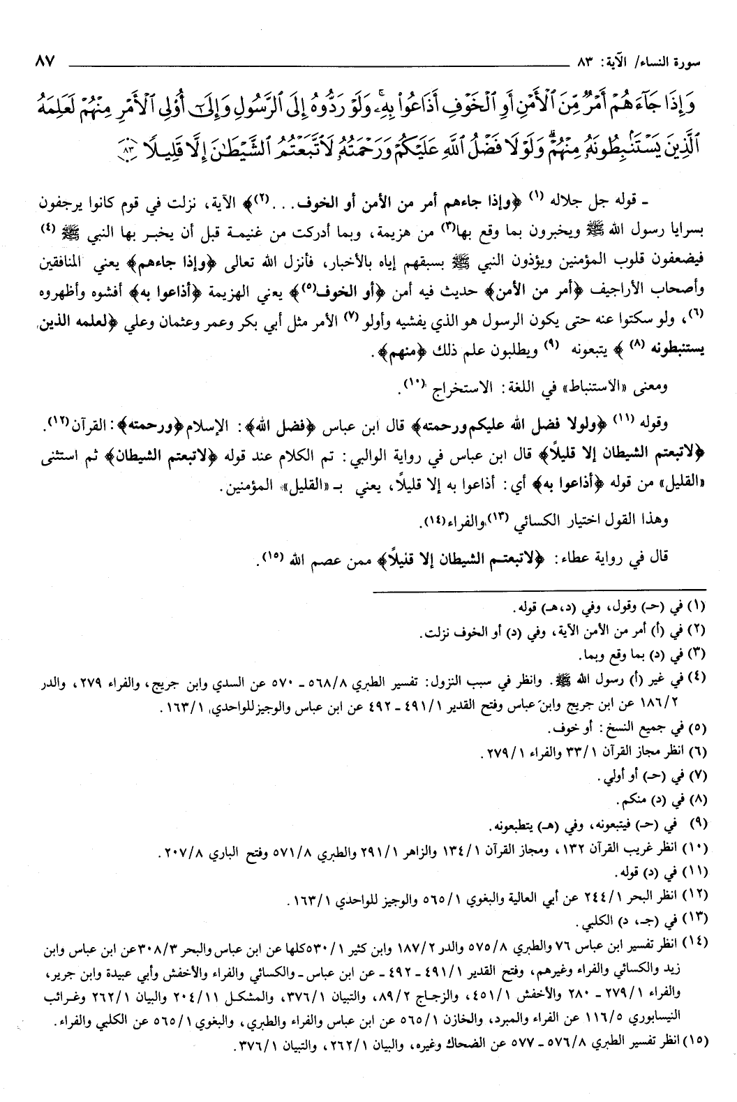 {وَإِذَا جَاءَهُمْ أَمْرٌ مِنَ الأَمْنِ أَوِ الْخَوْفِ أَذَاعُوا بِهِ وَلَوْ رَدُّوهُ إِلَى الرَّسُولِ وَإِلَى أُولِي الأَمْرِ مِنْهُمْ لَعَلِمَهُ الَّذِينَ يَسْتَنْبِطُونَهُ مِنْهُمْ وَلَوْلا فَضْلُ اللَّهِ عَلَيْكُمْ وَرَحْمَتُهُ لاتَّبَعْتُمُ الشَّيْطَانَ إِلا قَلِيلا} [النساء: 83] قوله جل جلاله: {وَإِذَا جَاءَهُمْ أَمْرٌ مِنَ الأَمْنِ أَوِ الْخَوْفِ} [النساء: 83] الآية، نزلت في قوم كانوا يرجفون بسرايا رسول الله صَلَّى اللهُ عَلَيْهِ وَسَلَّمَ، ويخبرون بما وقع بها من هزيمة، وبما أدركت من غنيمة قبل أن يخبر بها النبي صَلَّى اللهُ عَلَيْهِ وَسَلَّمَ، فيضعفون قلوب المؤمنين ويؤذون النبي صَلَّى اللهُ عَلَيْهِ وَسَلَّمَ بسبقهم إياه بالأخبار، فأنزل الله تعالى وإذا جاءهم يعني المنافقين وأصحاب الأراجيف، {أَمْرٌ مِنَ الأَمْنِ} [النساء: 83] حديث فيه أمن، أو الخوف: يعني الهزيمة أذاعوا به: أفشوه وأظهروه، ولو سكتوا عنه حتى يكون الرسول هو الذي يفشيه، وأولو الأمر مثل أبي بكر وعمر وعثمان وعلي {لَعَلِمَهُ الَّذِينَ يَسْتَنْبِطُونَهُ} [النساء: 83] يتبعونه ويطلبون علم ذلك منهم.