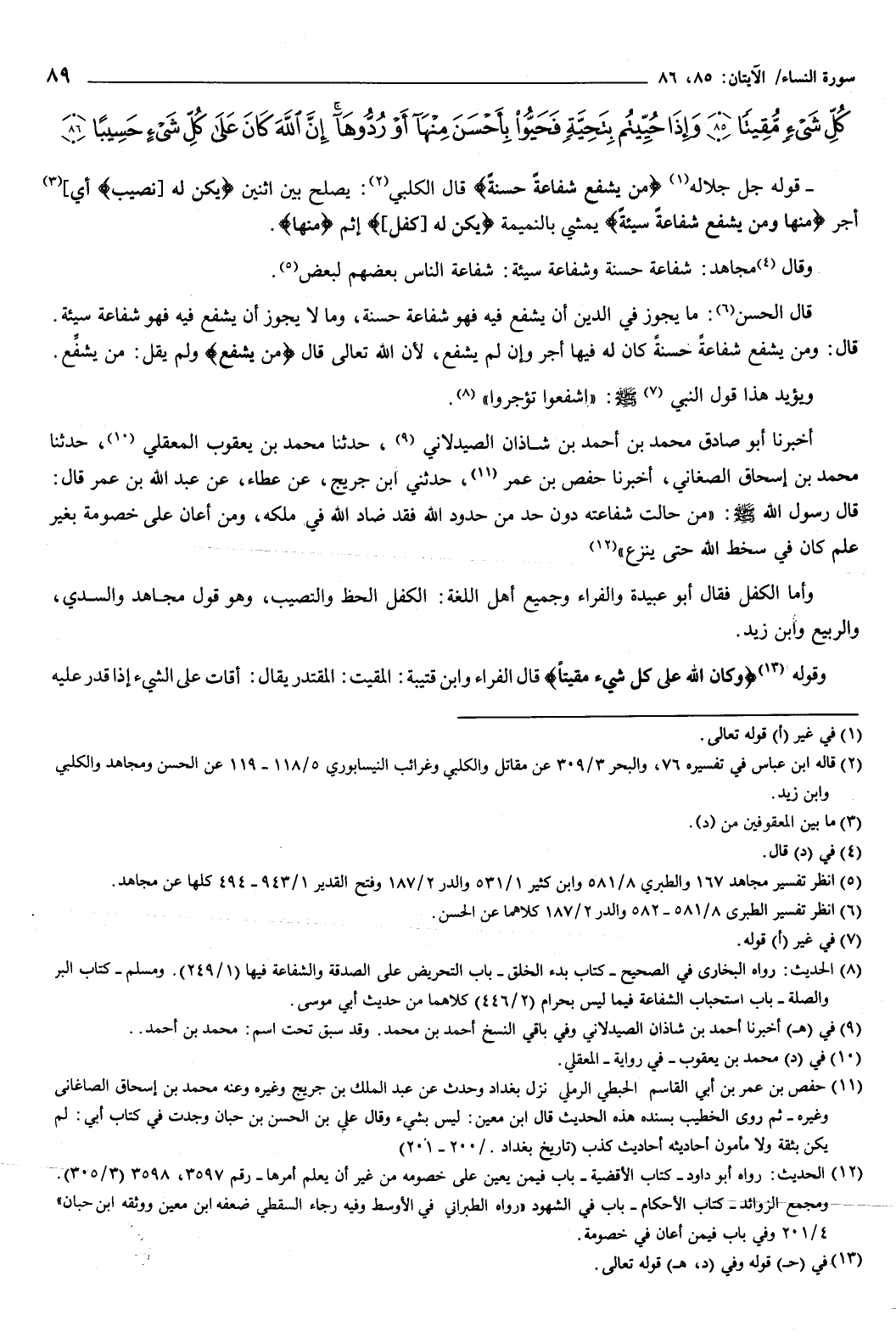كُلِّ شَيْءٍ مُقِيتًا {85} وَإِذَا حُيِّيتُمْ بِتَحِيَّةٍ فَحَيُّوا بِأَحْسَنَ مِنْهَا أَوْ رُدُّوهَا إِنَّ اللَّهَ كَانَ عَلَى كُلِّ شَيْءٍ حَسِيبًا {86} } [النساء: 85-86] قوله جل جلاله: {مَنْ يَشْفَعْ شَفَاعَةً حَسَنَةً} [النساء: 85] قال الكلبي: يصلح بين اثنين.