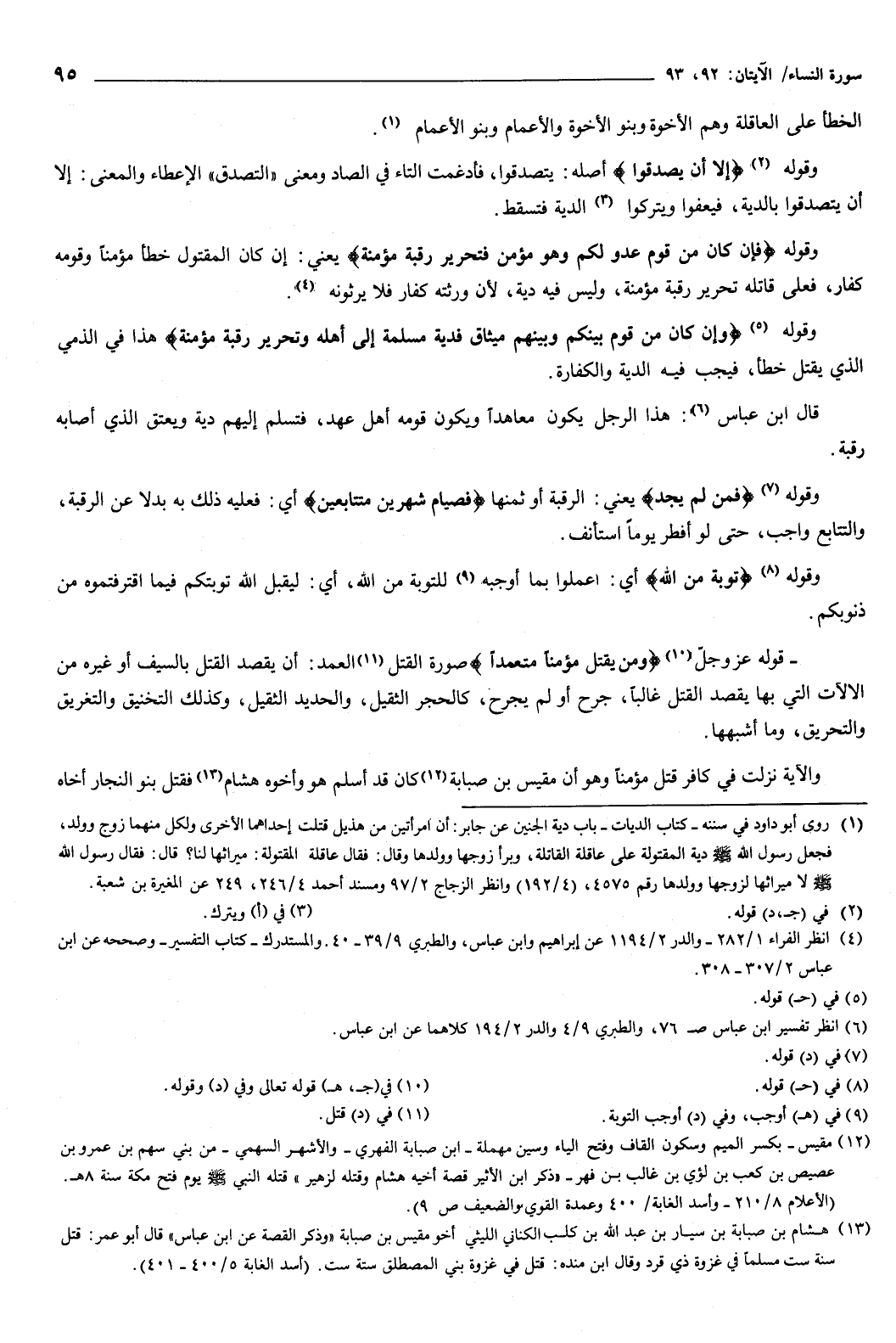 وقوله: {فَإِنْ كَانَ مِنْ قَوْمٍ عَدُوٍّ لَكُمْ وَهُوَ مُؤْمِنٌ فَتَحْرِيرُ رَقَبَةٍ مُؤْمِنَةٍ} [النساء: 92] يعني: إن كان المقتول خطأ مؤمنا وقومه كفار، فعلى قاتله تحرير رقبة مؤمنة، وليس فيه دية، لأن ورثته كفار فلا يرثونه.