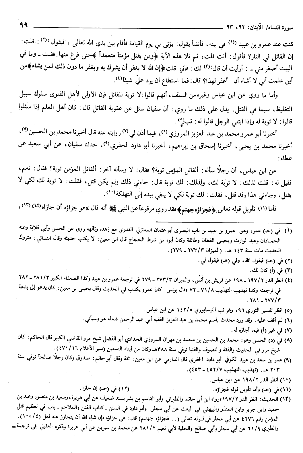 كنت عند عمرو بن عبيد، فأنشأ يقول: يؤتى بي يوم القيامة فأقام بين يدي الله تعالي، فيقول: قلت: إن القاتل في النار؟ فأقول: أنت قلت، ثم تلا هذه الآية: {وَمَنْ يَقْتُلْ مُؤْمِنًا مُتَعَمِّدًا} [النساء: 93] حتى فرغ منها، فقلت وما في البيت أصغر مني: أرأيت أن قال لك: فإني قلت: {إِنَّ اللَّهَ لا يَغْفِرُ أَنْ يُشْرَكَ بِهِ وَيَغْفِرُ مَا دُونَ ذَلِكَ لِمَنْ يَشَاءُ} [النساء: 116] ، من أين علمت أني لا أشاء أن أغفر لهذا؟ قال: فما استطاع أن يرد علي شيئا.