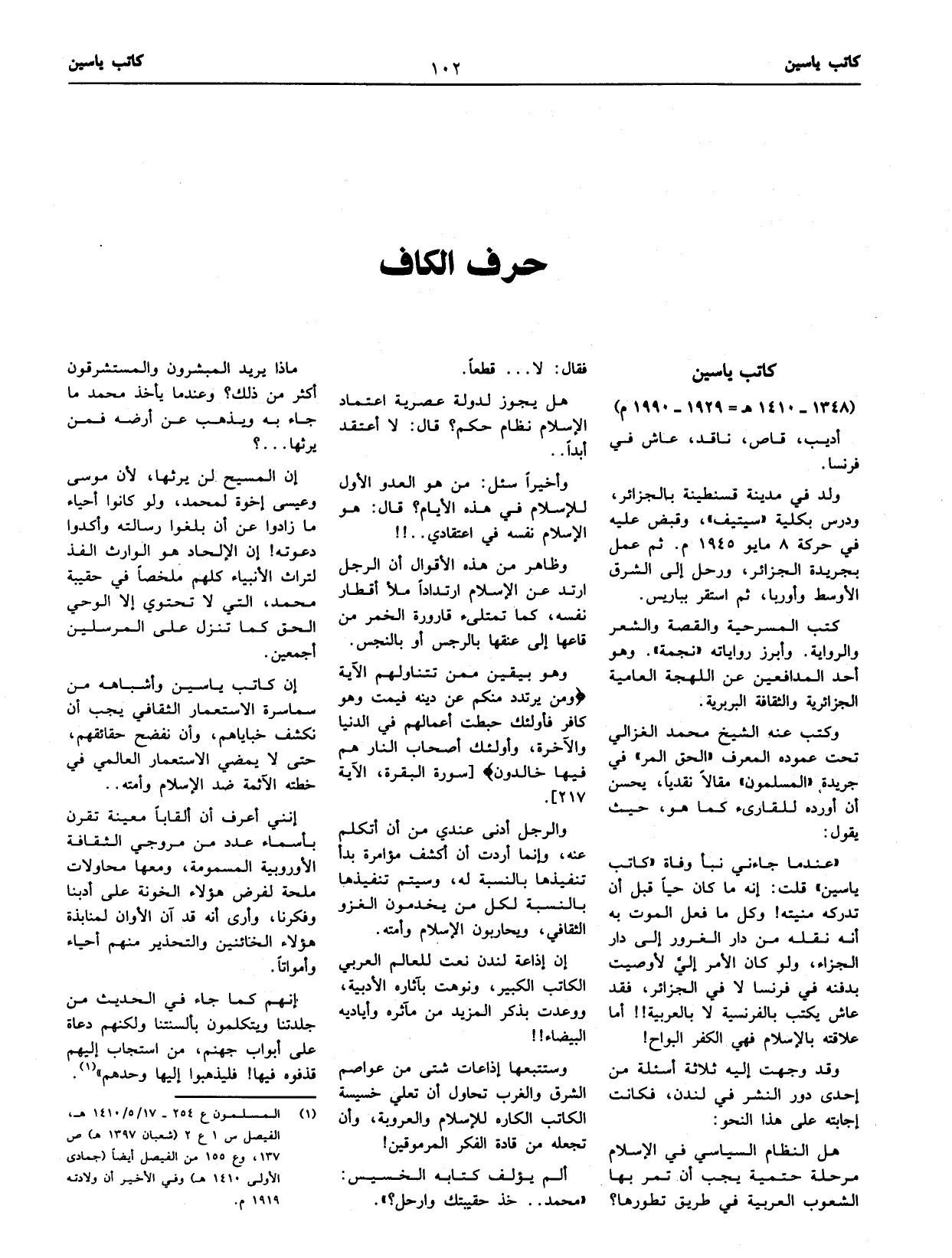 «عند ما جاءني نبأ وفاة «كاتب ياسين» قلت: إنه ما كان حيا قبل أن تدركه منيته! وكل ما فعل الموت به أنه نقله من دار الغرور إلى دار الجزاء، ولو كان الأمر إليّ لأوصيت بدفنه في فرنسا لا في الجزائر، فقد عاش يكتب بالفرنسية لا بالعربية! ! أما علاقته بالإسلام فهي الكفر البواح!