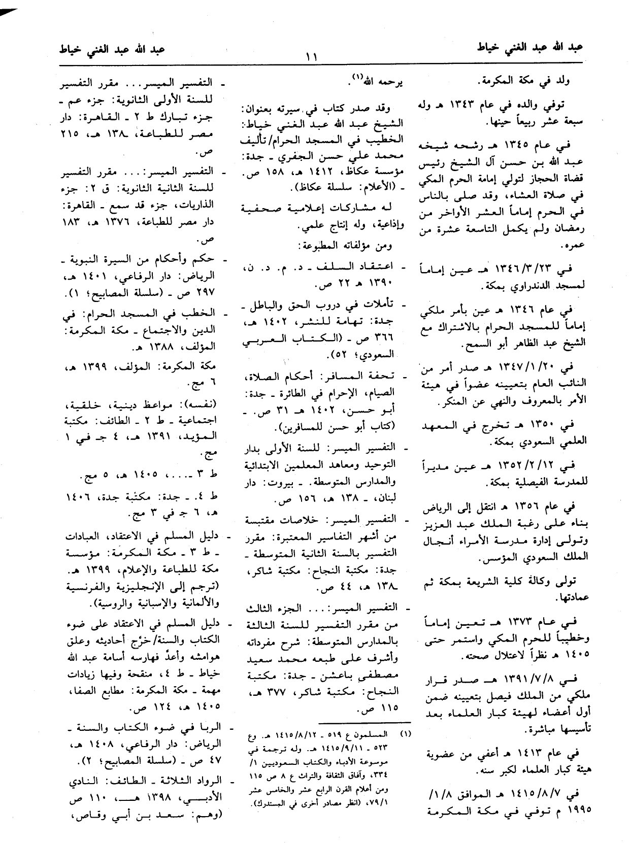 (¬1) المسلمون ع 519 - 12/ 8/ 1415 هـ. وع 523 - 11/ 9/ 1415 هـ. وله ترجمة في موسوعة الأدباء والكتاب السعوديين 1/ 334، وآفاق الثقافة والتراث ع 8 ص 115 ومن أعلام القرن الرابع عشر والخامس عشر 1/ 79، (انظر مصادر أخرى في المستدرك).