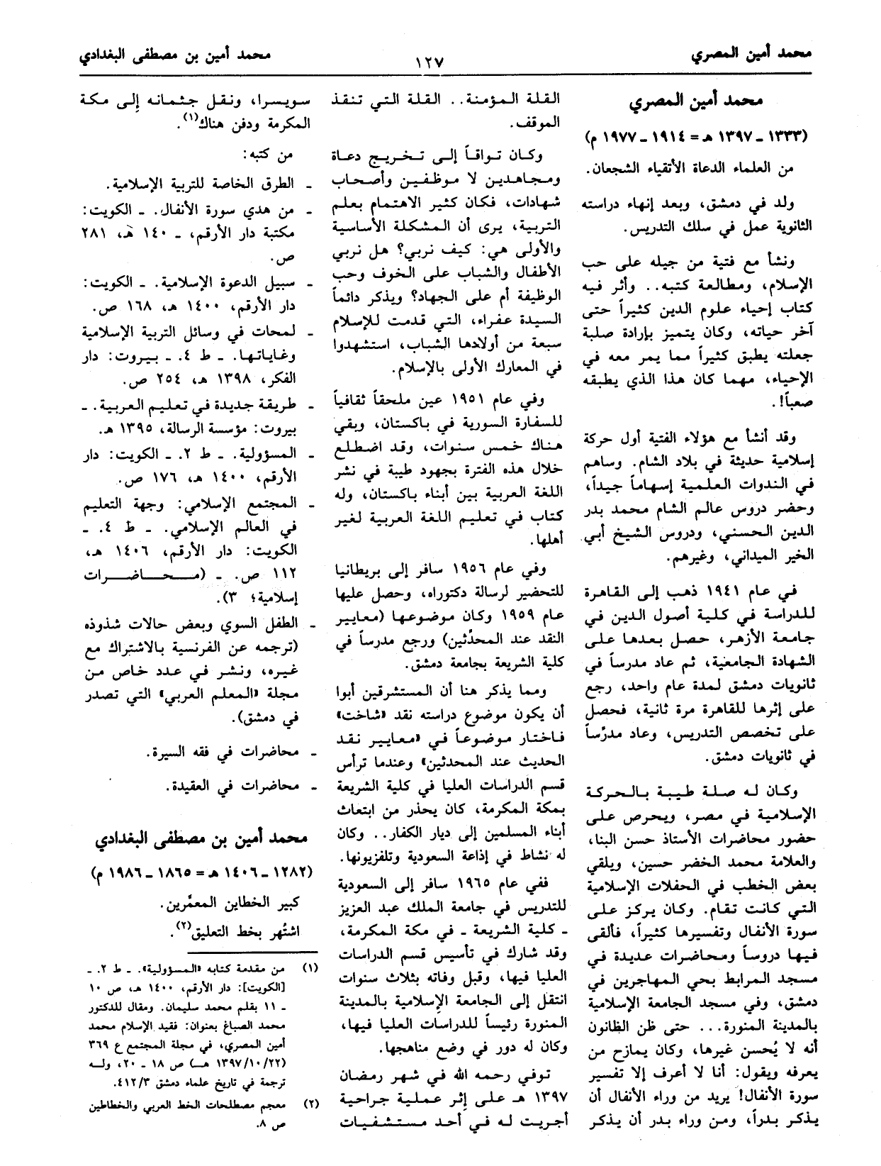 (¬1) من مقدمة كتابه «المسؤولية».- ط 2.-[الكويت]: دار الأرقم، 1400 هـ، ص 10 - 11 بقلم محمد سليمان. ومقال للدكتور محمد الصباغ بعنوان: فقيد الإسلام محمد أمين المصري، في مجلة المجتمع ع 369 (22/ 10/ 1397 هـ) ص 18 - 20، وله ترجمة في تاريخ علماء دمشق 3/ 412.