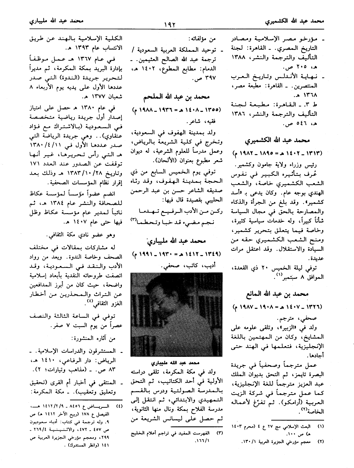 (¬4) الرياض ع 8456 - 9/ 2/ 1412 هـ، الفيصل ع 178 (ربيع الآخر 1412 هـ) ص 9. وله ترجمة في كتاب: أدباء سعوديون ص 457 - 472، والاثنينية 4/ 269 - 299، ومعجم مؤرخي الجزيرة العربية ص 141 (وانظر المستدرك).