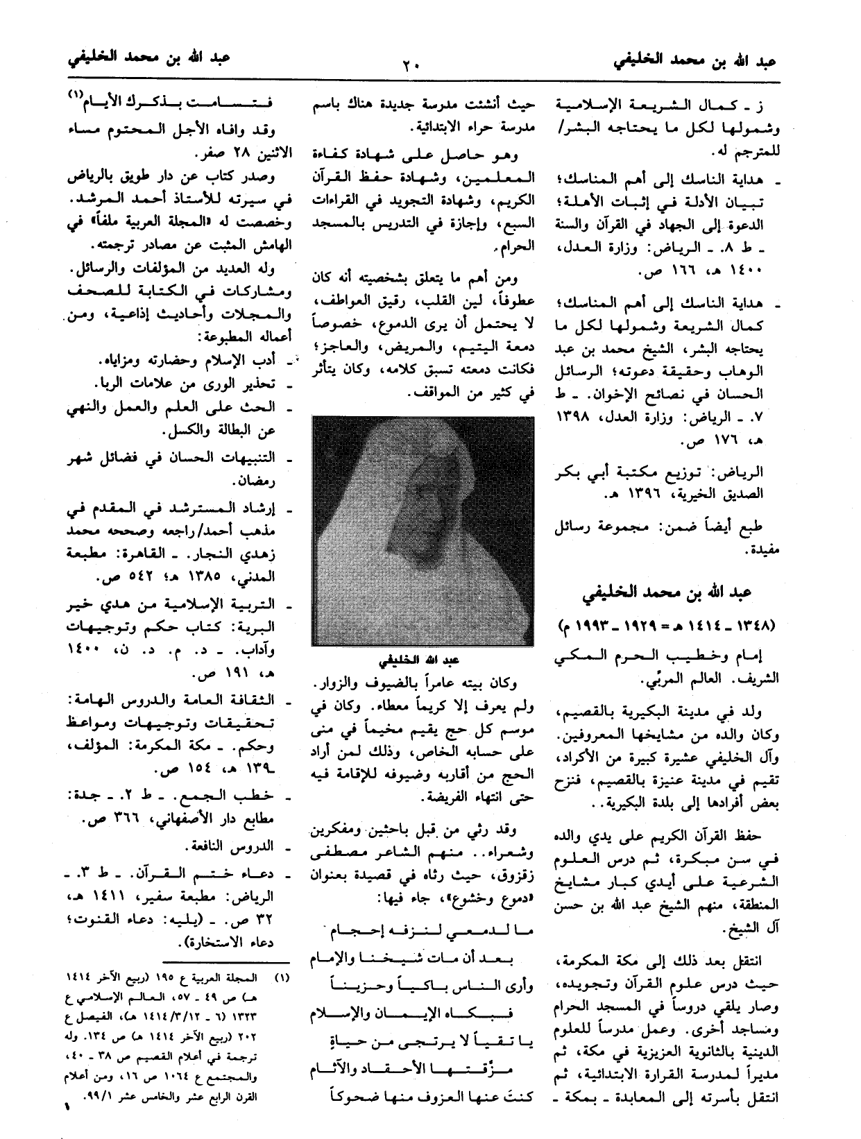 (¬1) المجلة العربية ع 195 (ربيع الآخر 1414 هـ) ص 49 - 57، العالم الإسلامي ع 1323 (6 - 12/ 3/ 1414 هـ)، الفيصل ع 202 (ربيع الآخر 1414 هـ) ص 134. وله ترجمة في أعلام القصيم ص 38 - 40، والمجتمع ع 1064 ص 16، ومن أعلام القرن الرابع عشر والخامس عشر 1/ 99.