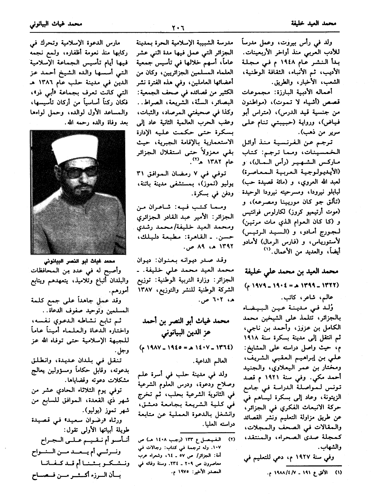 (¬2) الفيصل ع 133 (رجب 1408 هـ) ص 107. وله ترجمة في كتاب: رجالات في أمة: الجزائر/ ص 57 - 64، وشعراء عرب معاصرون ص 209 - 234. وسنة وفاته في المصدر الأخير: 1975 م.
