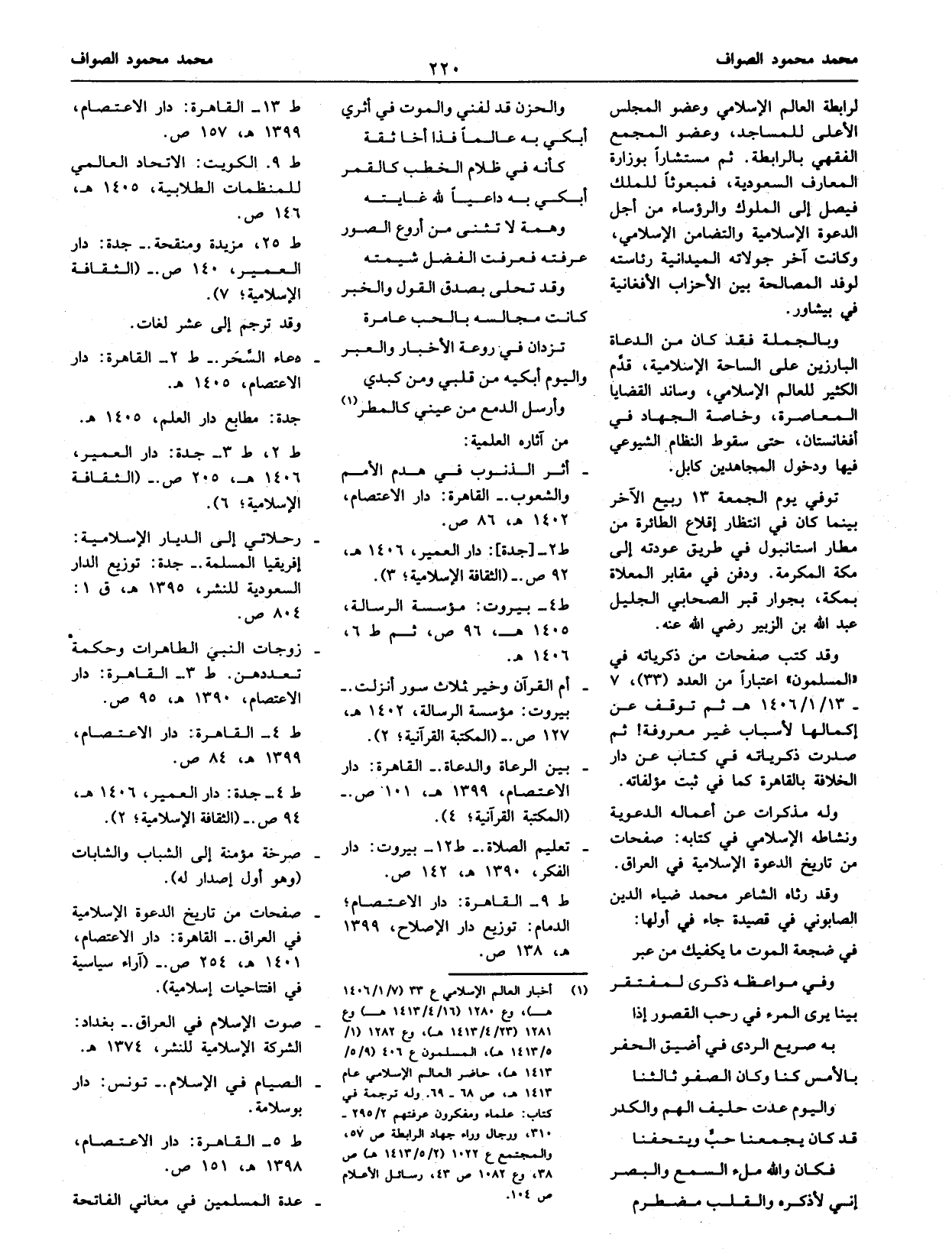 (¬1) أخبار العالم الإسلامي ع 33 (7/ 1/ 1406 هـ)، وع 1280 (16/ 4/ 1413 هـ) وع 1281 (23/ 4/ 1413 هـ)، وع 1282 (1/ 5/ 1413 هـ)، المسلمون ع 406 (9/ 5/ 1413 هـ)، حاضر العالم الإسلامي عام 1413 هـ، ص 68 - 69. وله ترجمة في كتاب: علماء ومفكرون عرفتهم 2/ 295 - 310، ورجال وراء جهاد الرابطة ص 57، والمجتمع ع 1022 (2/ 5/ 1413 هـ) ص 38، وع 1082 ص 43، رسائل الأعلام ص 104.