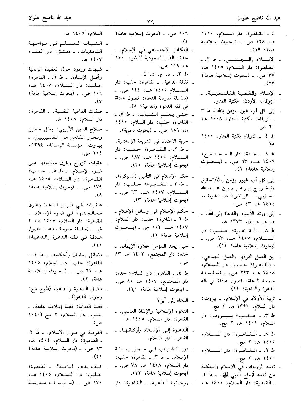 - ثقافة الداعية.- القاهرة: حلب: دار السّلام 1405 هـ، 144 ص.- (سلسلة مدرسة الدعاة: فصول هادفة في فقه الدعوة والداعية؛ 8).